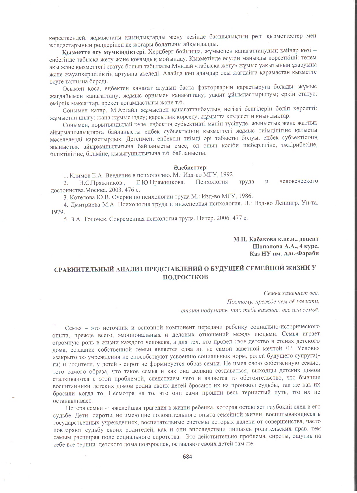 Социально-психологическое исследование модели будущей семьи и семейных отношений у воспитанников детского дома //Психология здоровья человека в глобализирующемся мире: Сб. статей междун. научной конф., 25-26 апреля 2013г.– Астана: ЕНУ, 2013. – В 2-х тт.- Т.2.- С. 210-214 (0,32 п.л.) (в соавт. с Шопаловой А.А.)