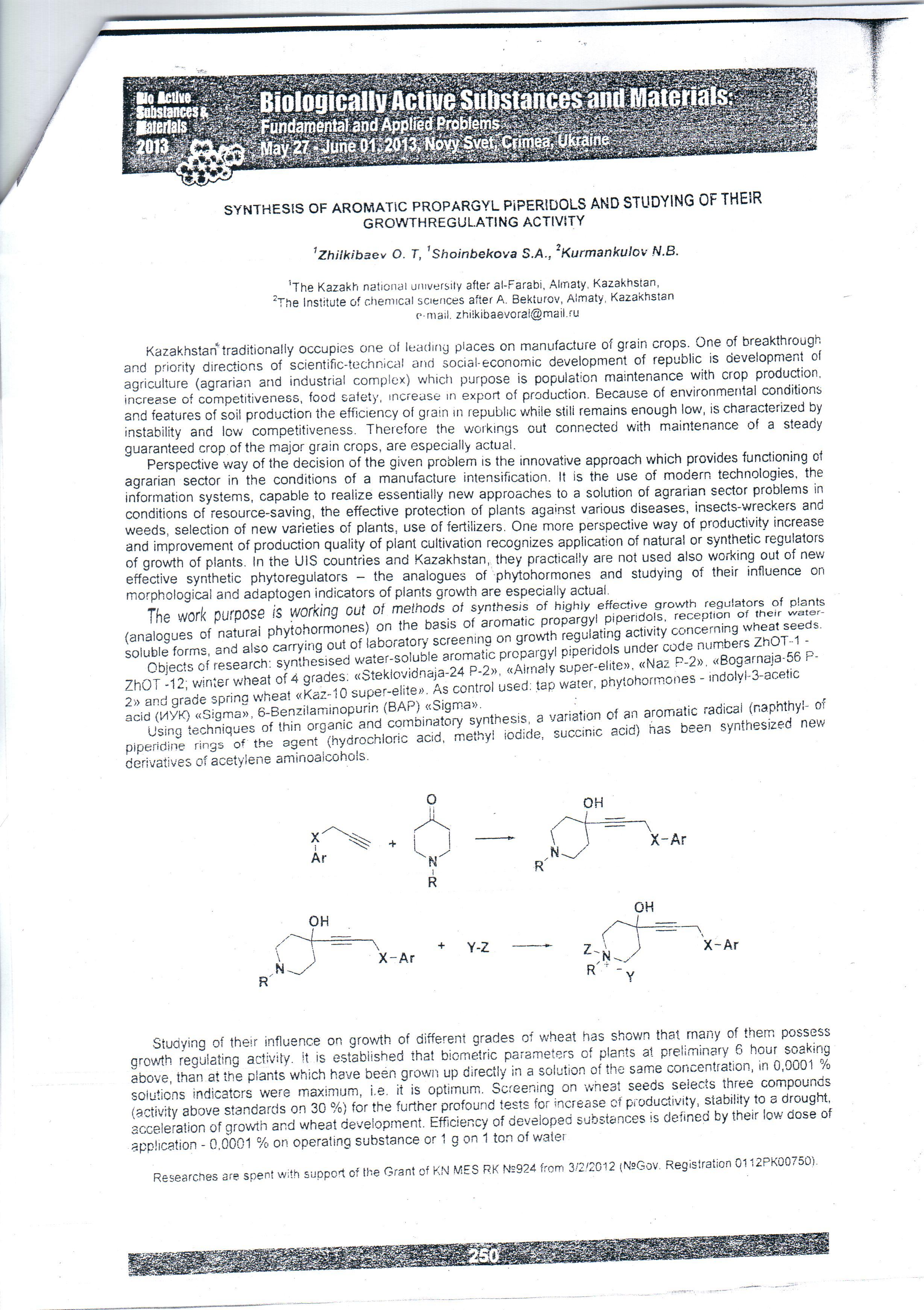 12. Жилкибаев О.Т., Шоинбекова С.А., Курманкулов Н.Б. Синтез ароматических пропаргиловых пиперидолов и изучение их рострегулирующей активности // Материалы междунар. IV–я междисципл. Конф. «Биологические активные вещества и материалы: фундаментальные и прикладные вопросы получения и применения. Украина. Крым, Новый Св