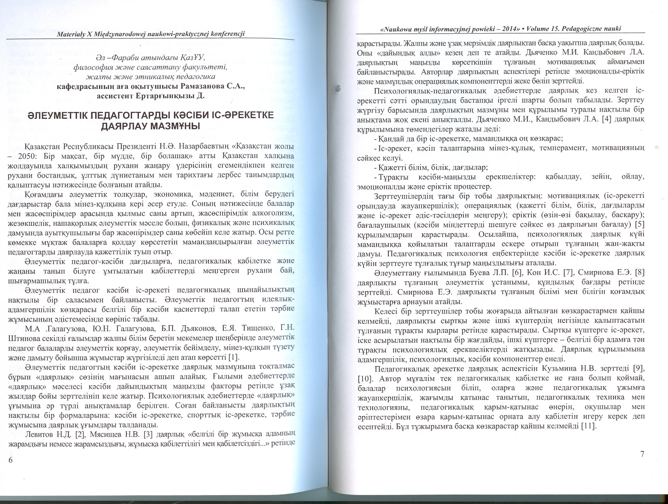 Әлеуметтік педагогтарды кәсіби іс-әрекетке даярлау мазмұны / Х Халықаралық ғылыми-практикалық конференция материалдары. Прага, 07-15 наурыз, 2014 жыл.