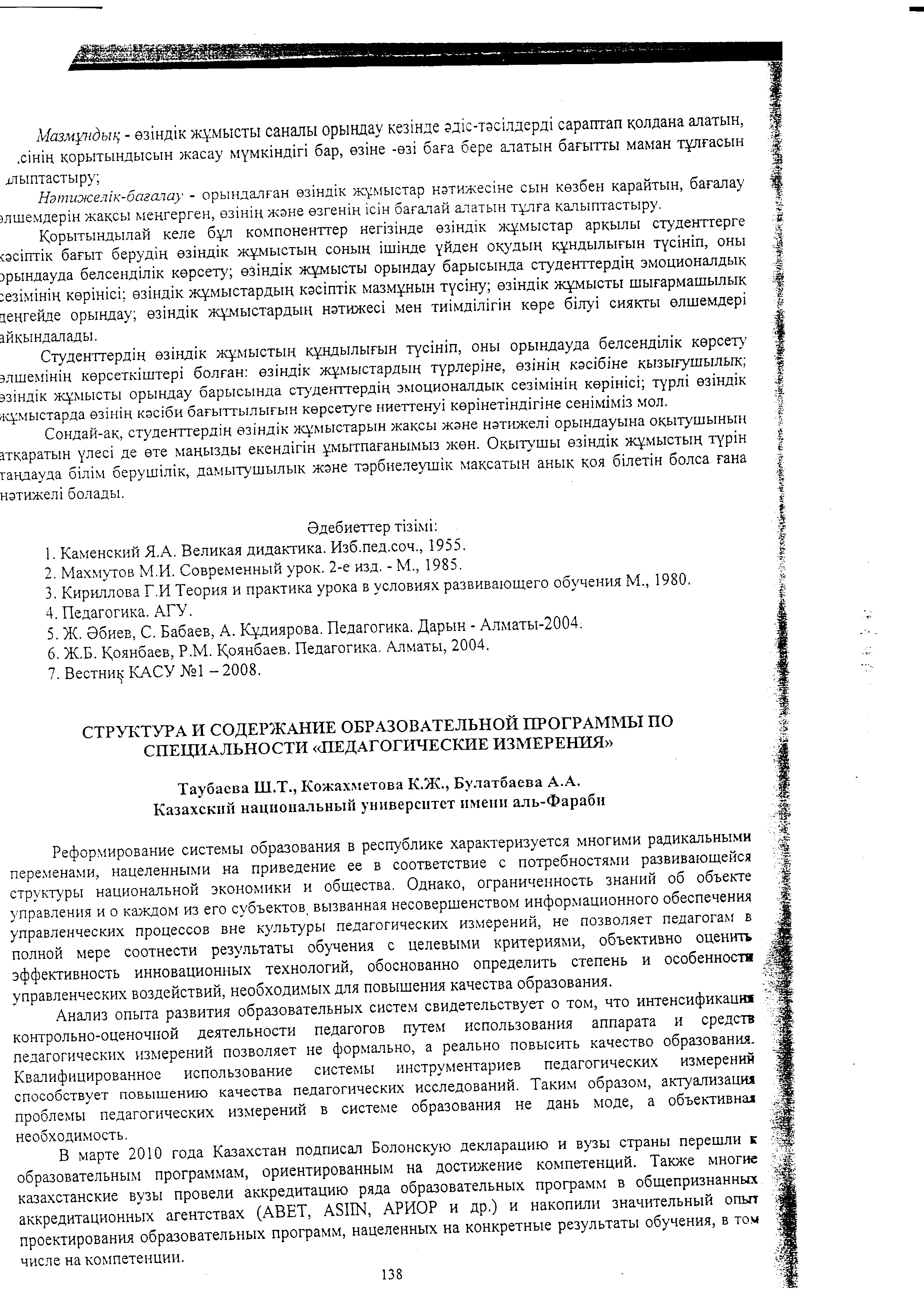 Реализация компетентностного подхода в системе послевузовского образования // Материалы 44 научно-методической конф. «Компетентностно-ориентированная система оценки знаний», Алматы, 2014. – Кн3. – С. 228-231