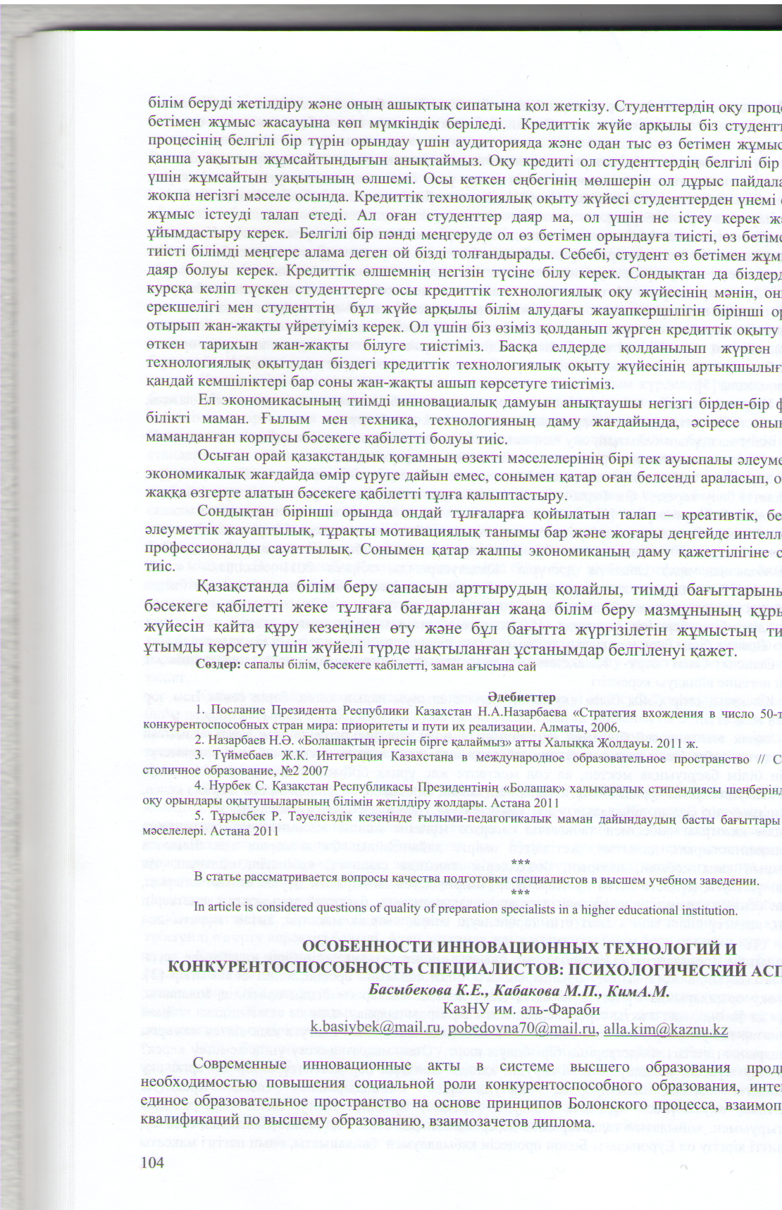 Особенности инновационных технологий и конкурентоспособность специалистов: психологический аспект //Инновации в образовательной деятельности и вопросы повышения качества обучения: материалы 42 Междун. научно-методической конф.: Книга 2.- Алматы: Казак университеты, 2012. – С.104-107, в соавт. , 0,3 п.л.