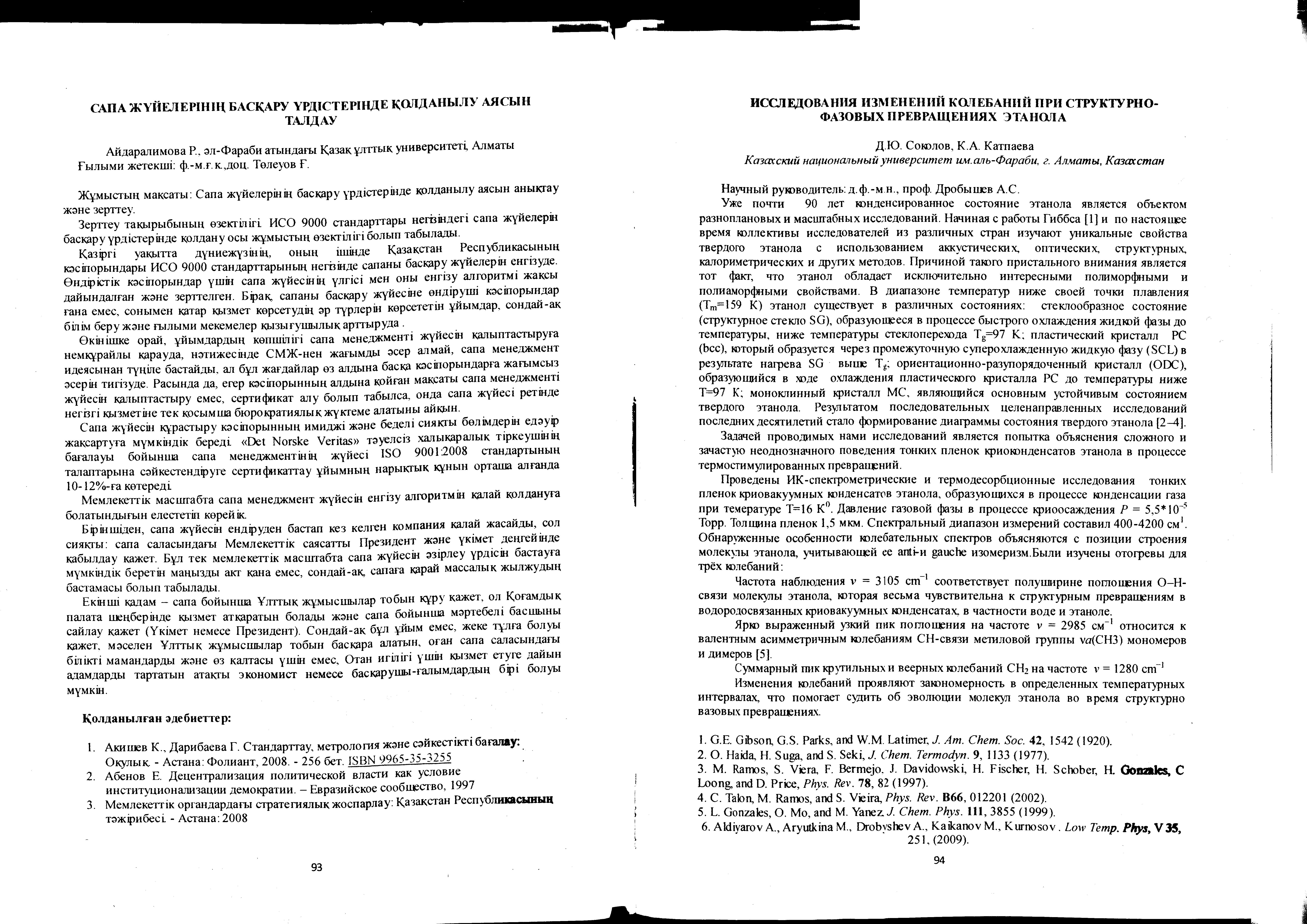 Соколов Д. Ю. Алдияров А.У., Дробышев А.С. Структурные превращения криоконденсата этанола в близи температуры стеклоперехода 2012 - г. 1 - стр.