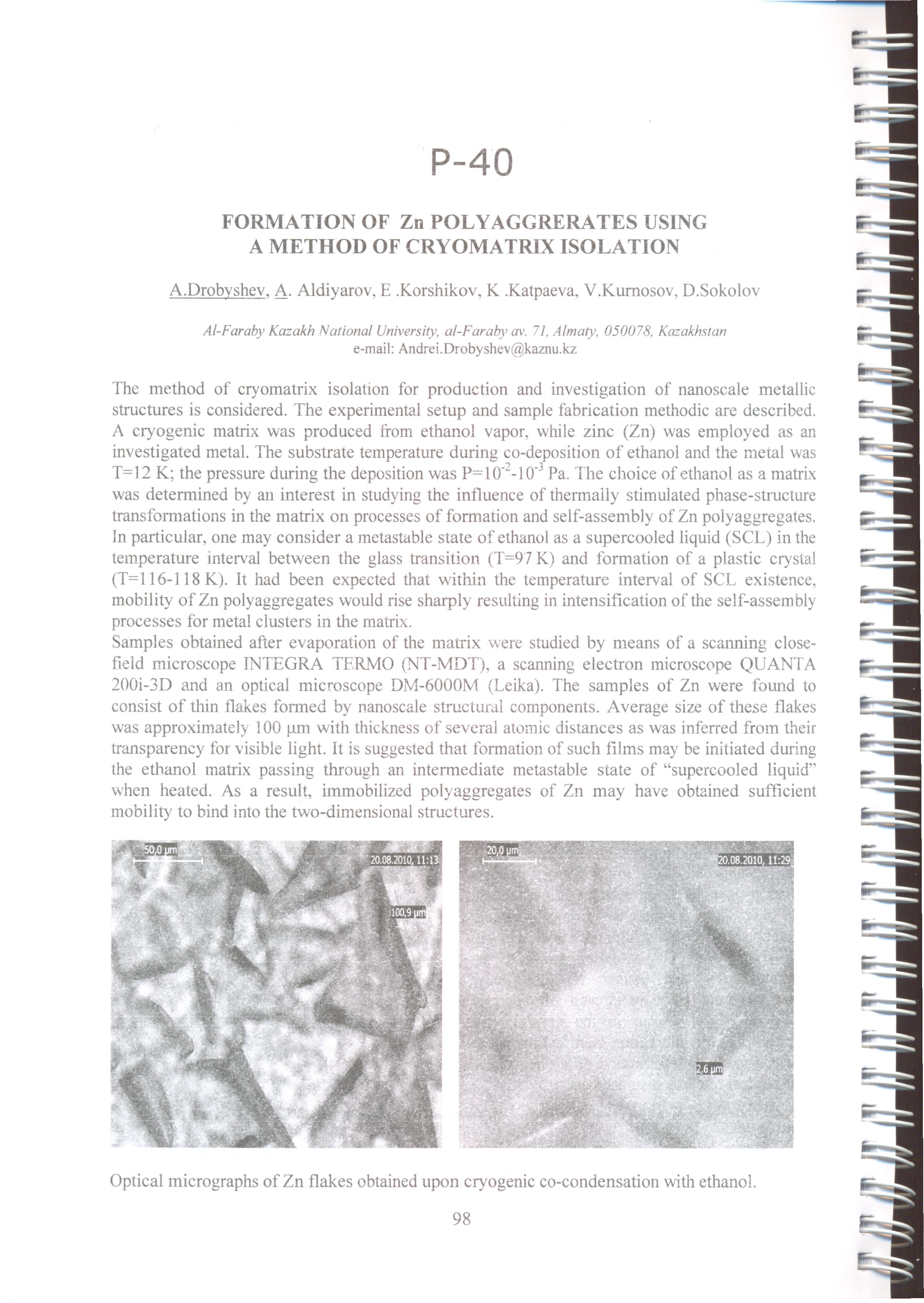 Алдияров А. У. Дробышев А.С., Соколов Д.Ю. Formation of Zn polyaggrerates ussing a metod of cryomatrix isolation 2012 - г. 1 - стр.