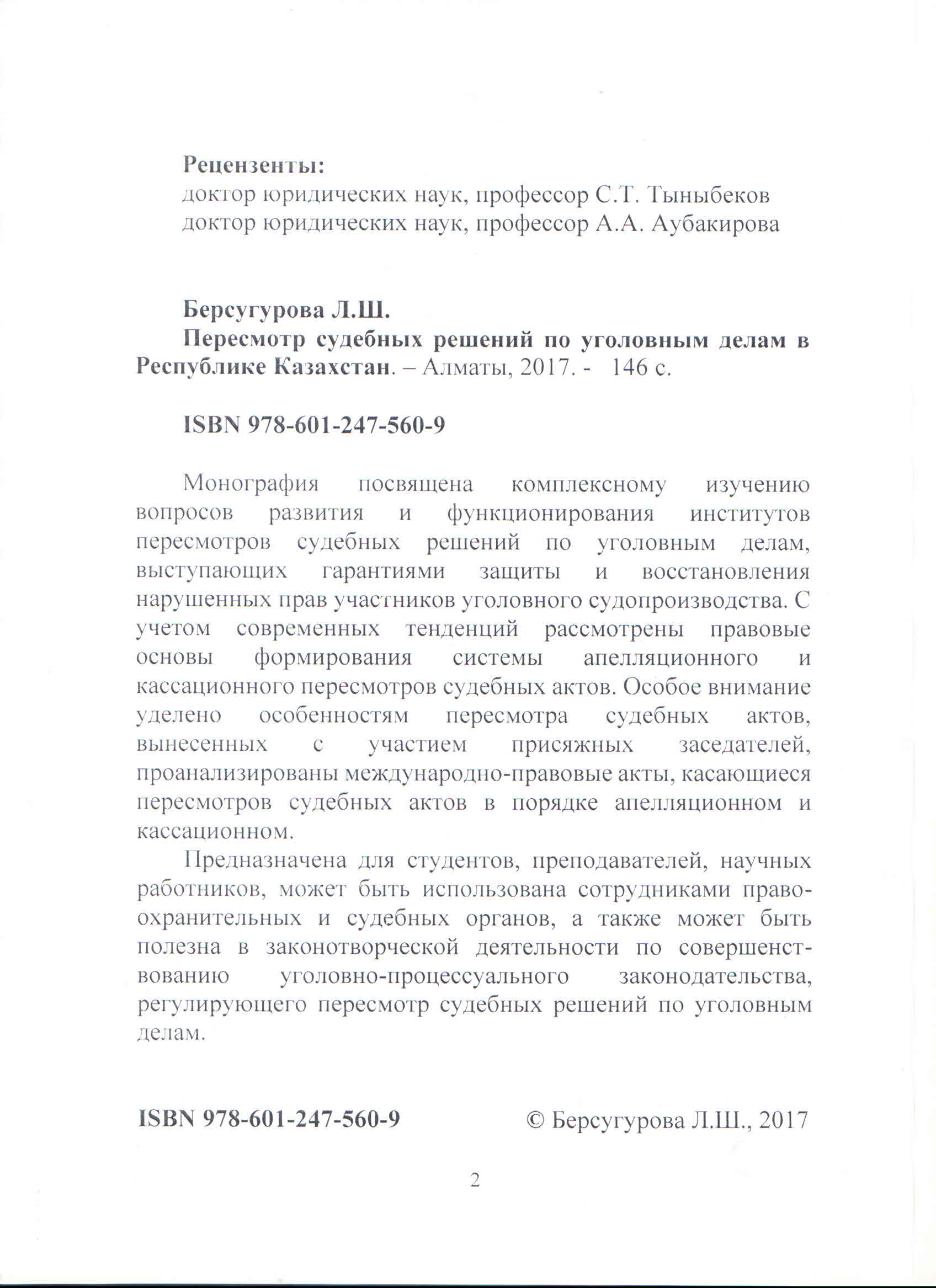 Берсугурова Л.Ш. Пересмотр судебных решений по уголовным делам в Республике Казахстан. – Алматы, 2017 – 9 п.л.