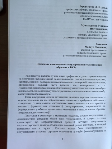 Жоғары оқу орындарындағы оқу процессі және студент (в соавт. Мухамадиева Г.Н., Баяндина М.О.) // Внедрение принципов болонской конвенции: проблемы реализации при подготовке магистрантов юридических специальностей: материалы международной учебно-методической конференции, 24 февраля 2015. – Алматы: КазНУ им. аль-Фараб