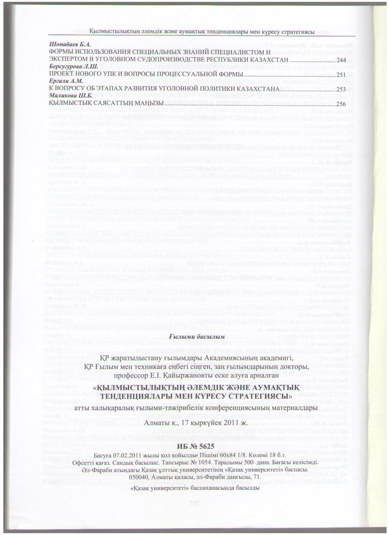 Қылмыстан сақтандыру: бәрін адам шешеді... басылған Материалы международной конференции «Современные технологии, механизмы и средства противодействия преступности» 27 апреля 2012 год. 85-89 бб