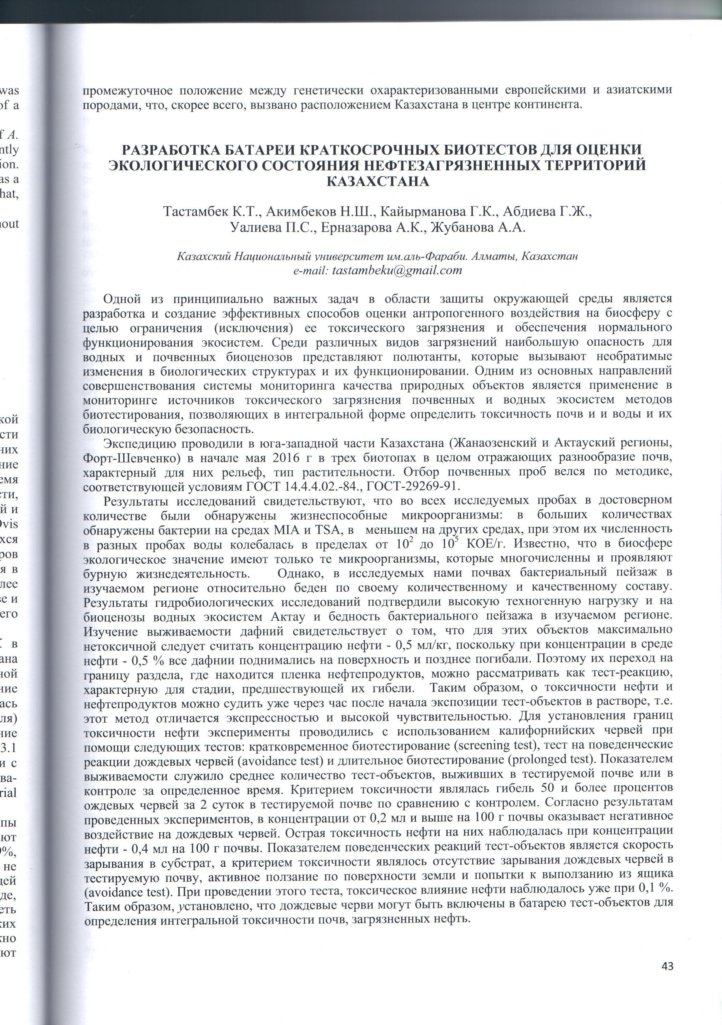 Разработка батареи краткосрочных биотестов для оценки экологического состояния нефтезагрезненных територий Казахстана