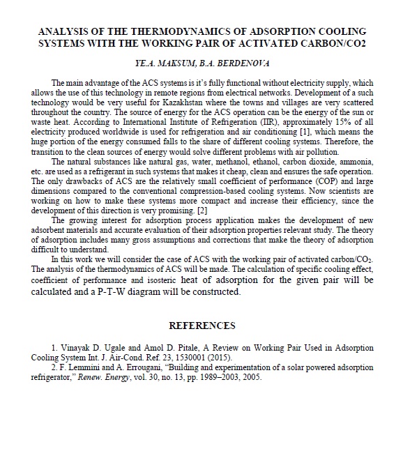 Берденова Б. А. Analysis of the thermodynamics of adsorption cooling systems with the working pair of activated carbon/CO2 2018 - г. 1 - стр.