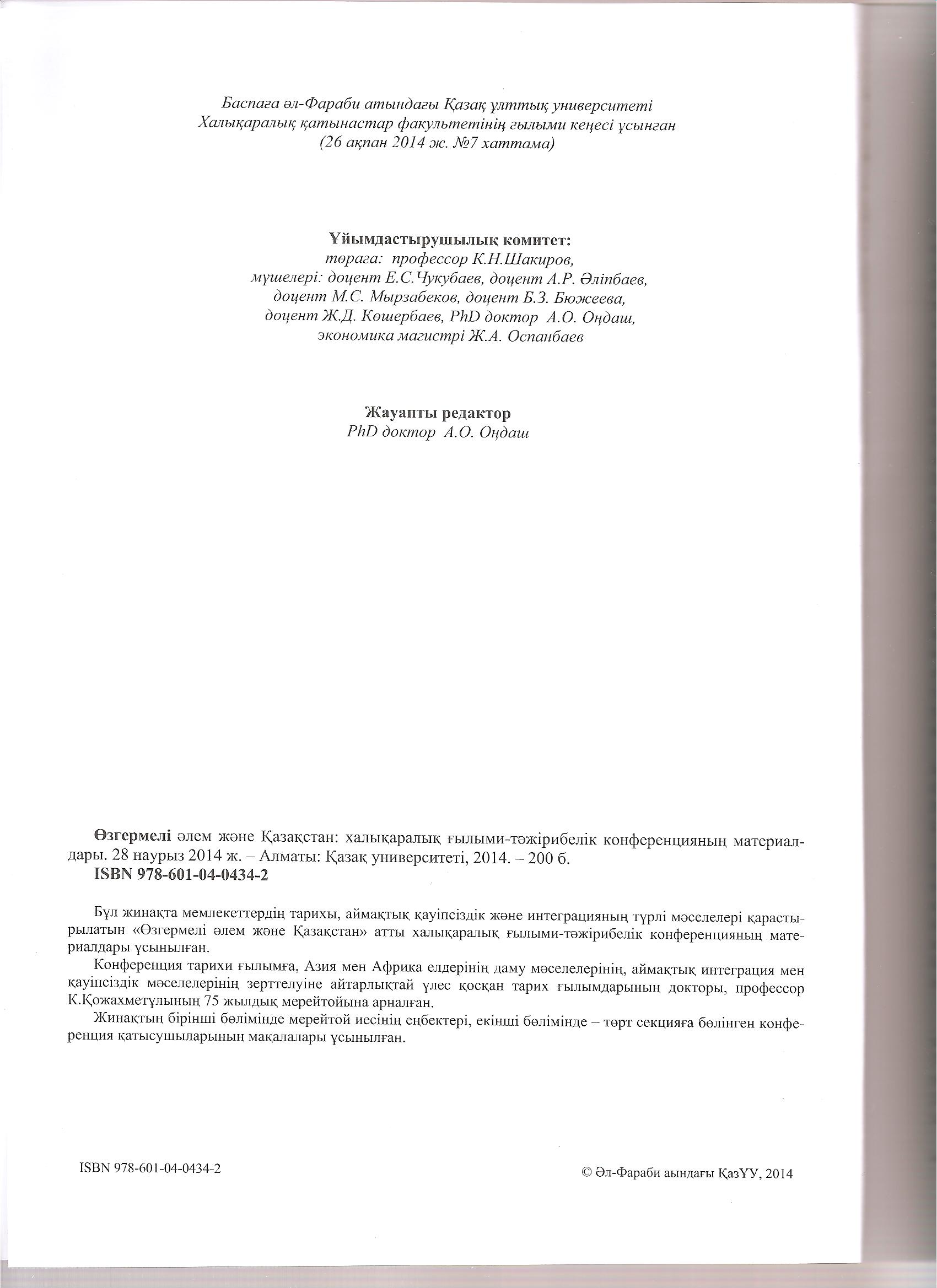 Басты бет / Халықаралық қатынастар / Халықаралық қатынастар және әлемдік экономика / Жинақтардағы, ғылыми мәслихаттардағы, симпозиумдардағы, семинарлардағы еңбектер (тезистер, баяндамалар)