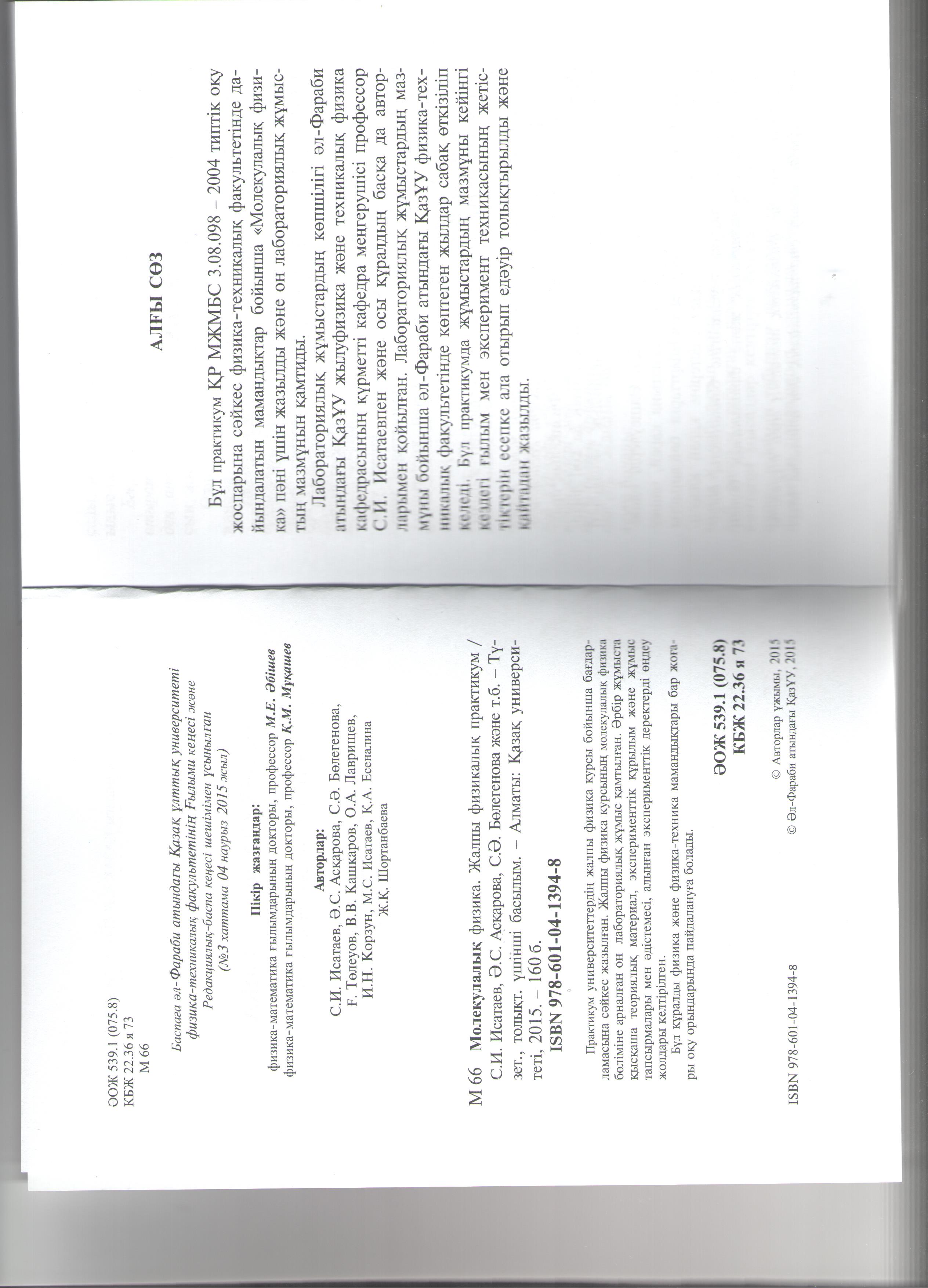 Молекулалық физика. Жалпы физикалық практикум. Æî¹àðû îºó îðûíäàðûíû» ñòóäåíòòåðiíå àðíàë¹àí îºó º½ðàëû. /Ñ.È.Èñàòàåâ, À.Ñ.Àñºàðîâà, Ñ.À.Á¼ëåãåíîâà, Ғ.Ò¼ëåóîâ, Â.Â.Êàøêàðîâ, È Î.À.Ëàâðèùåâ, È.Í.Êîðçóí, М.С. Исатаев, Қ.А.Есеналина, Ж.К.Шортанбаева – Àëìàòû: ²àçຠóíèâåðñèòåòi, 2015.-160 б.