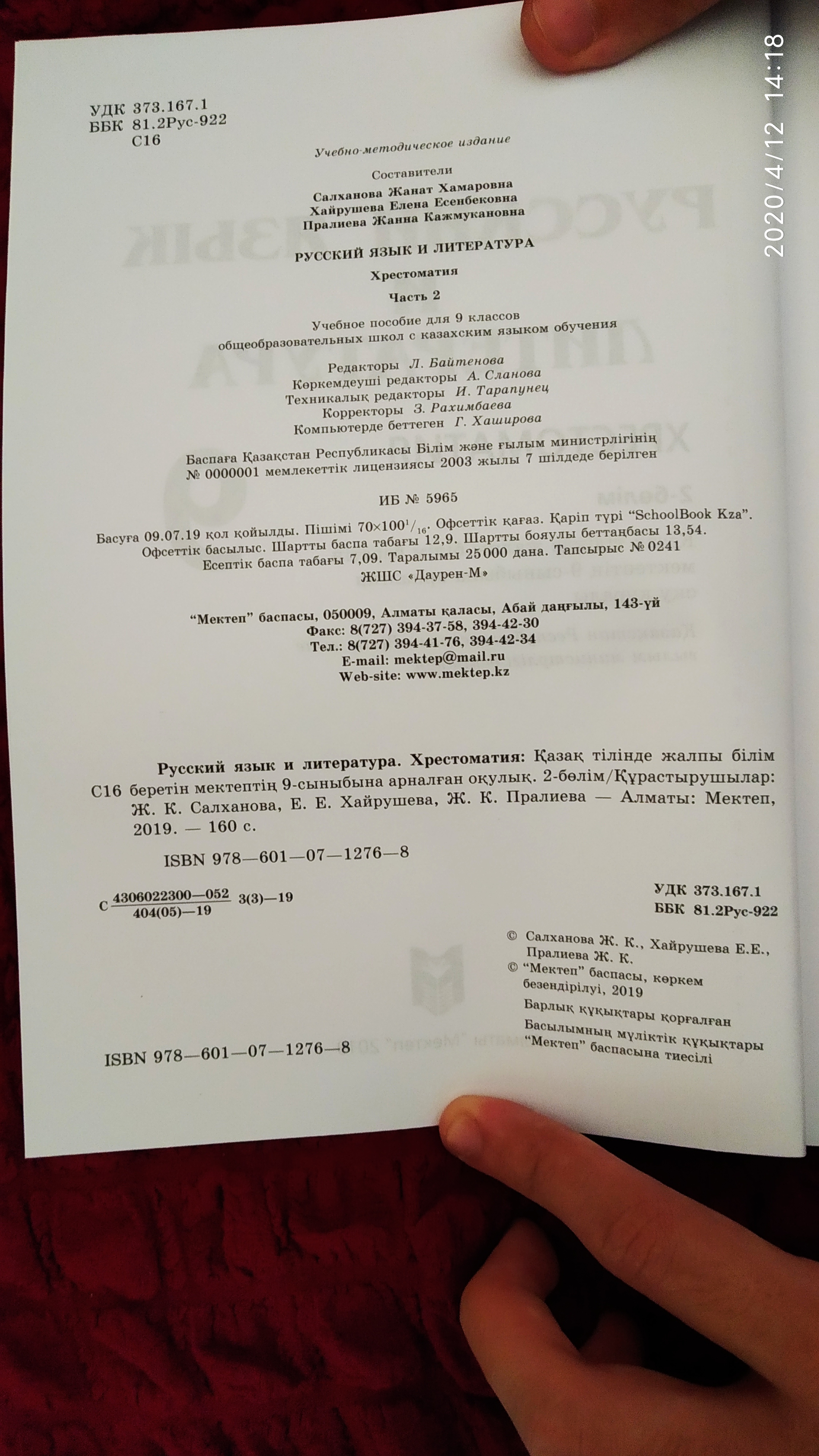 Русский язык и литература. Учебник для 9 классов общеобразовательных школ с казахским языком обучения. Ч. 2.