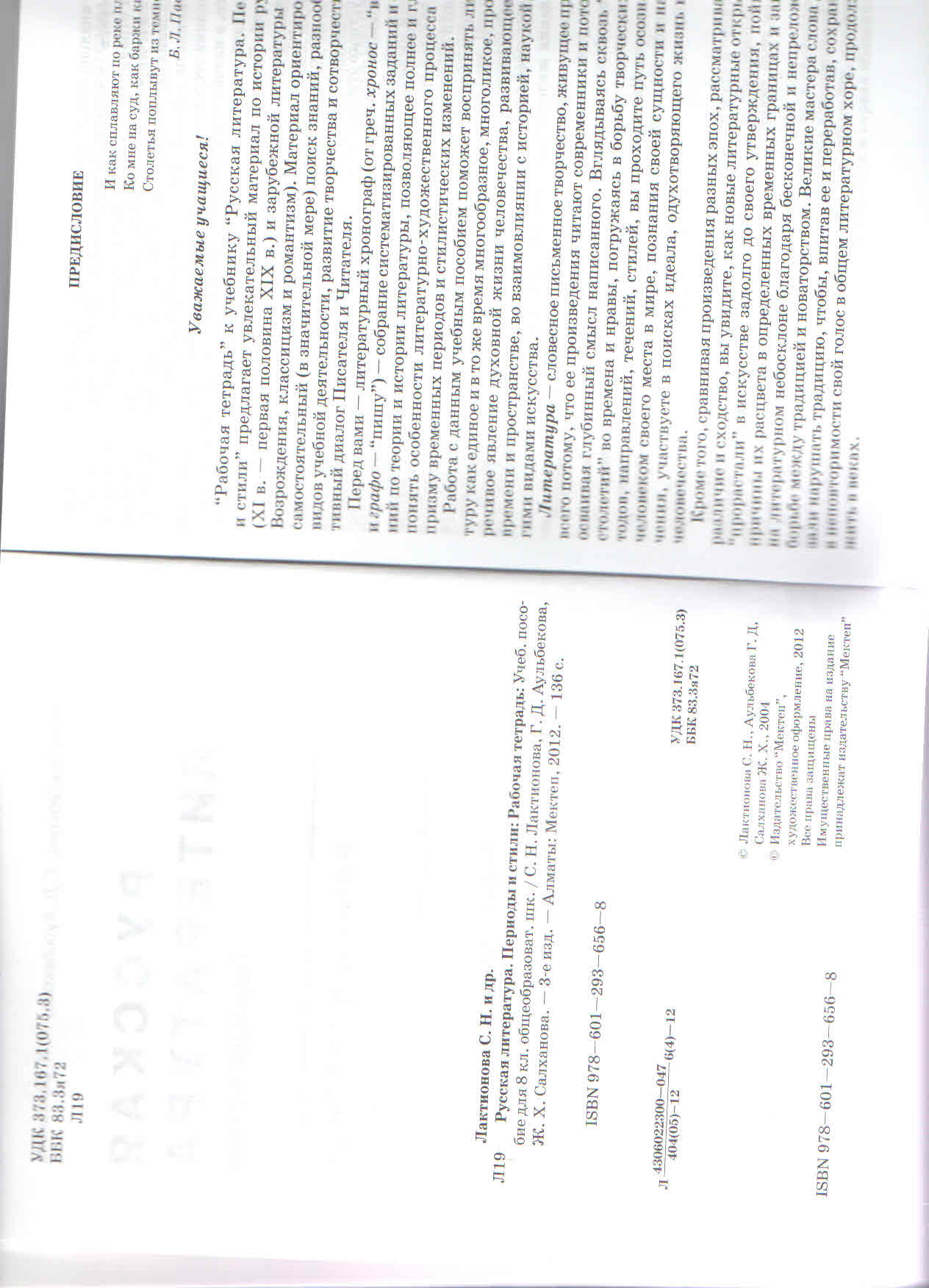 С.Н.Лактионова, , Г.Д.Аульбекова, Ж.Х.Салханова. Русская литература. Рабочая тетрадь к учебнику для 8 кл.общеобр.школ с русским языком обучения.-Алматы: Мектеп, 2012, 134с., ISBN-978-601-293-656-8.