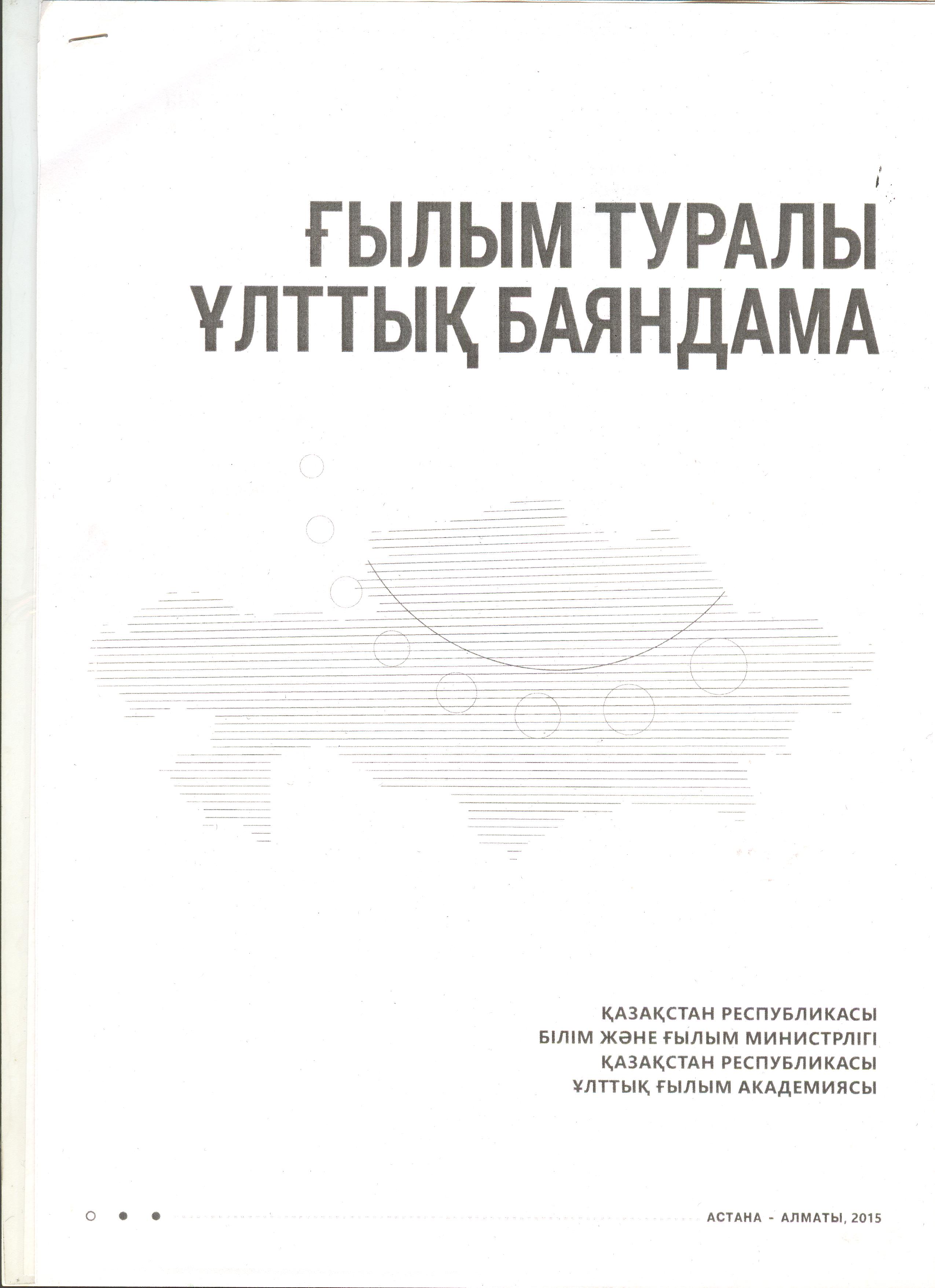 Ғылым туралы ұлттық баяндама Ескерту. Ғылым туралы Ұлттық баяндама Қазақстан Республикасы Президенті Н.Ә.Назарбаевтың 2012 жылғы 21 тамыздағы № 21 Жарлығымен 2015 жылғы 21 мамырдағы №27 өзгертулер енгізілуімен шығады