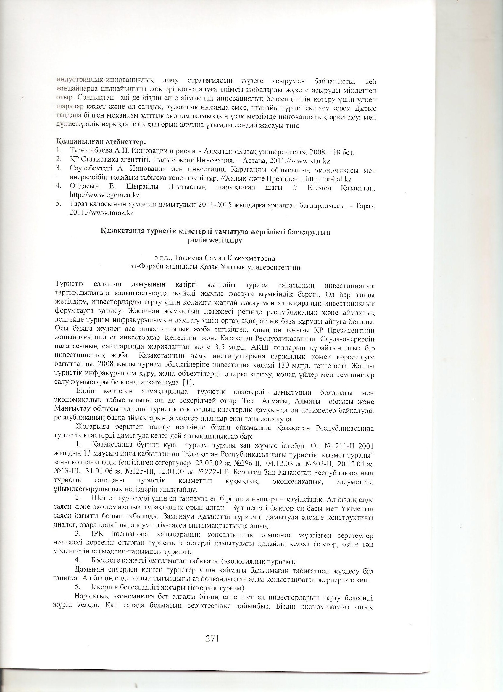 Қазақстанда туристік кластерді дамытуда жергілікті басқарудың ролін жетілдіру