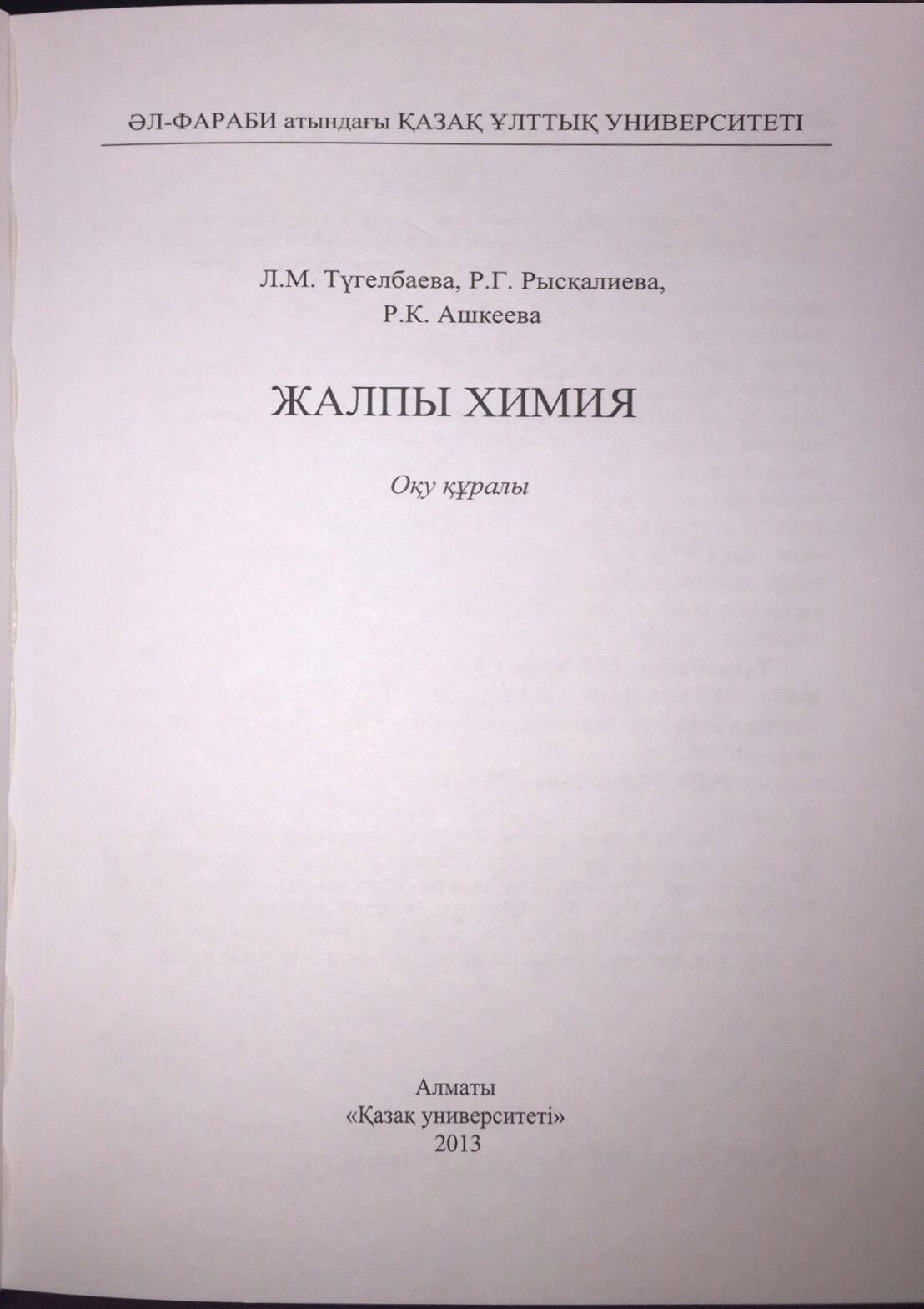 1.Баешов А., Баешова А.К., Баешова С.А. Электрохимия (теориясы мен қолданылуы): оқу құралы. – Алматы: Қазақ университеті, 2013. – 310 б. (19,5 б.т.). (РИСО)