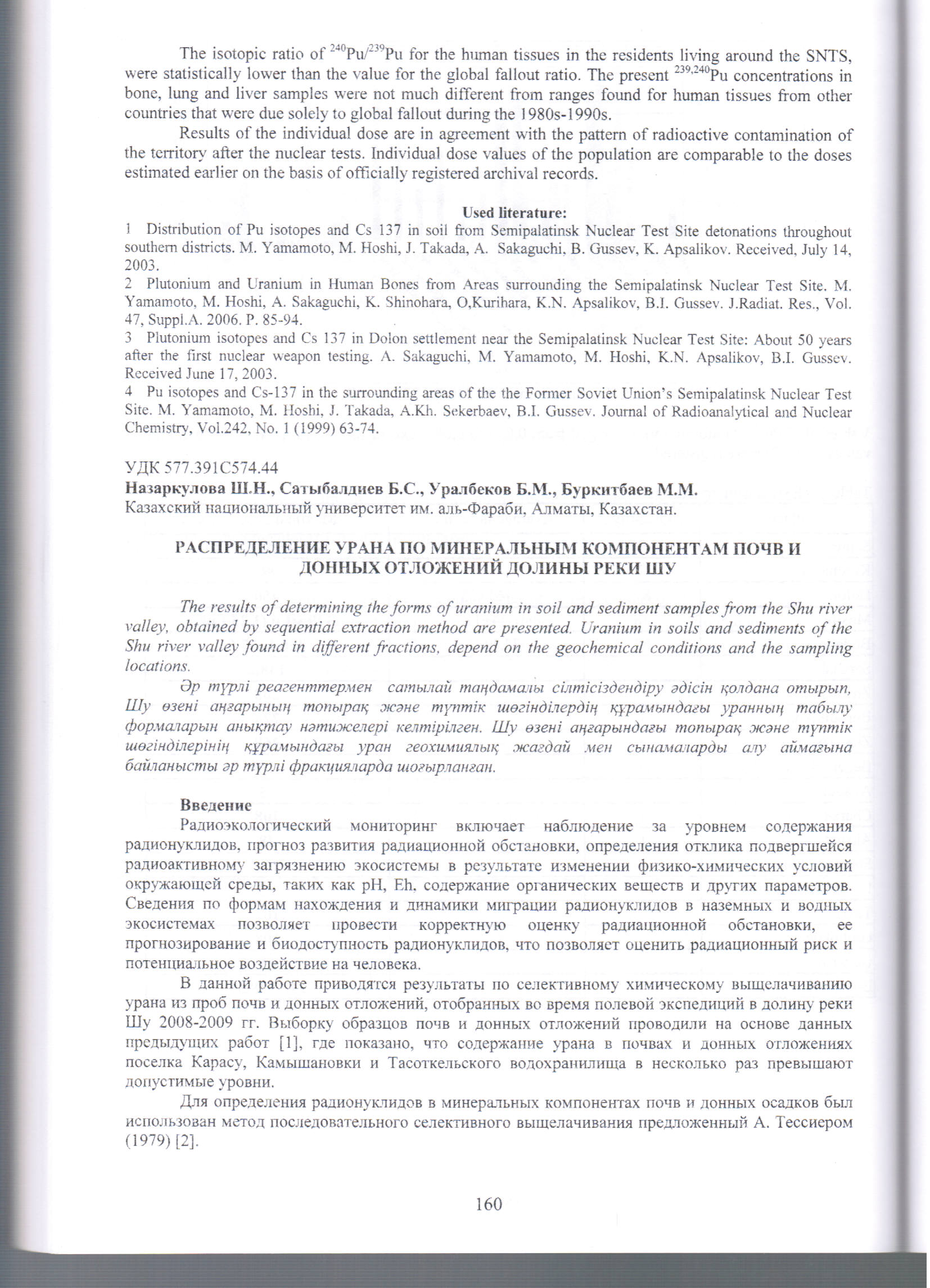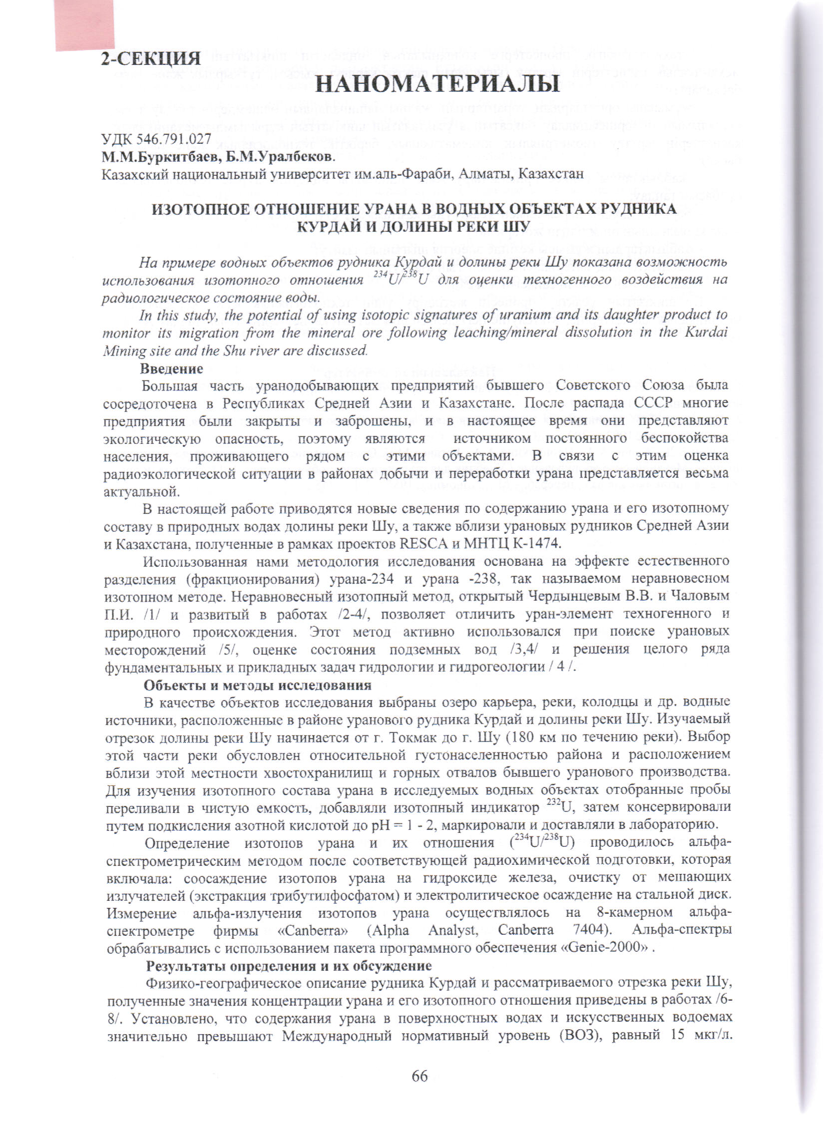 Изотопное отношение урана в водных объектах рудника Курдай и долины реки Шу