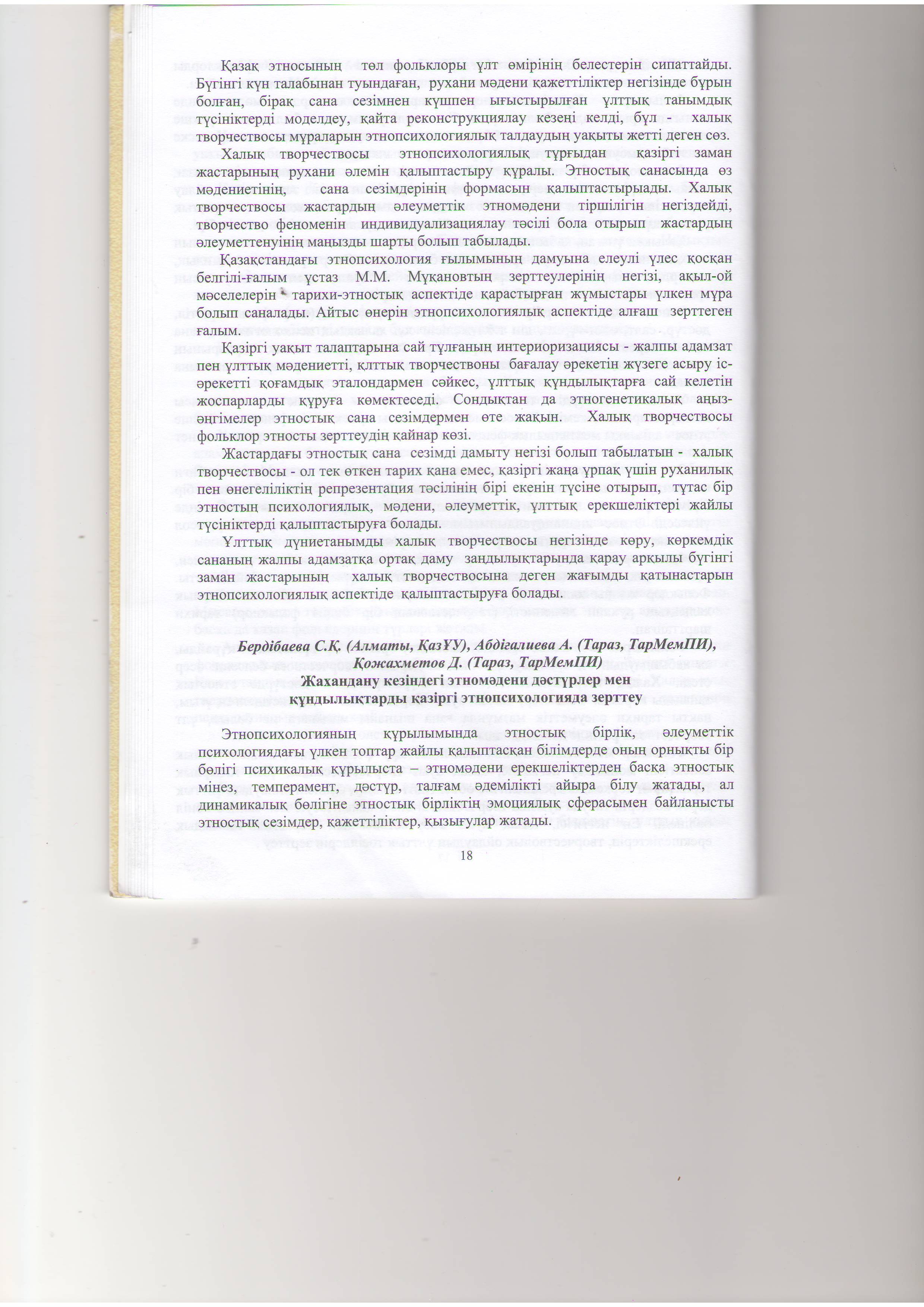 Жаһандану кезіндегі этно-мәдени дәстүрлер мен құндылықтарды қазіргі этнопсихологияда зерттеу. \\Респ.ғыл. практ.конф. мат. ҚазҰУ.-2011. .Алматы, 3 б