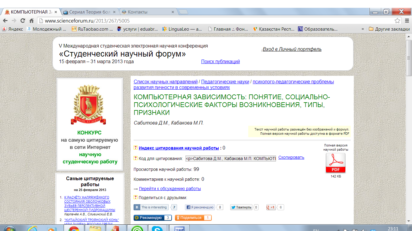 Компьютерная зависимость: понятие, социально-психологические факторы возникновения, типы, признаки V Межд. студ. электронная научная конфер. «Студенческий научный форум» Российской Академии Естествознания. Психологические науки. 15 февраля – 31 марта 2013 года. http://www.scienceforum.ru/2013/12 (в соавт. Сабитовой Д.