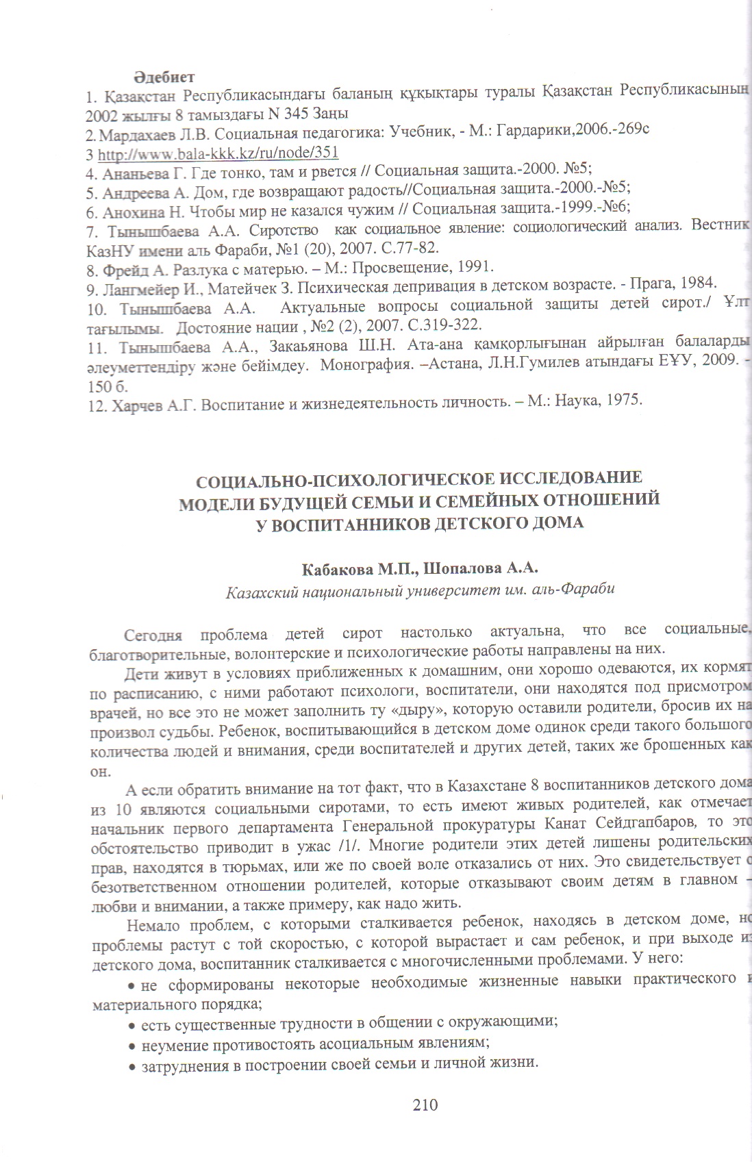 Социально-психологическое исследование модели будущей семьи и семейных отношений у воспитанников детского дома //Психология здоровья человека в глобализирующемся мире: Сб. статей междун. научной конф., 25-26 апреля 2013г.– Астана: ЕНУ, 2013. – В 2-х тт.- Т.2.- С. 210-214 (0,32 п.л.) (в соавт. с Шопаловой А.А.)
