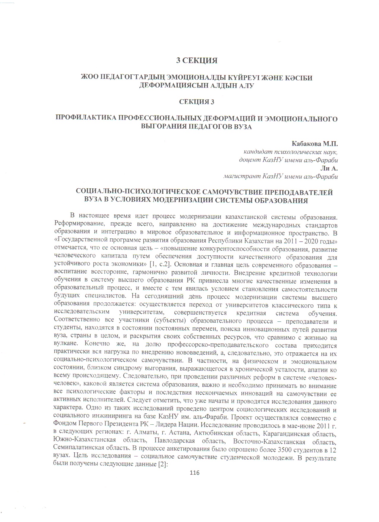 Социально-психологическое самочувствие преподавателей вуза в условиях модернизации системы образования // Психолого-педагогические аспекты труда и личности преподавателя инновационного университета: Матер. МНП конфер., в рамках Т. Тажибаевских чтений. - Алматы: Қазақ университеті, 2013. - С.116-120 (всоавт. с Ли А.В.)