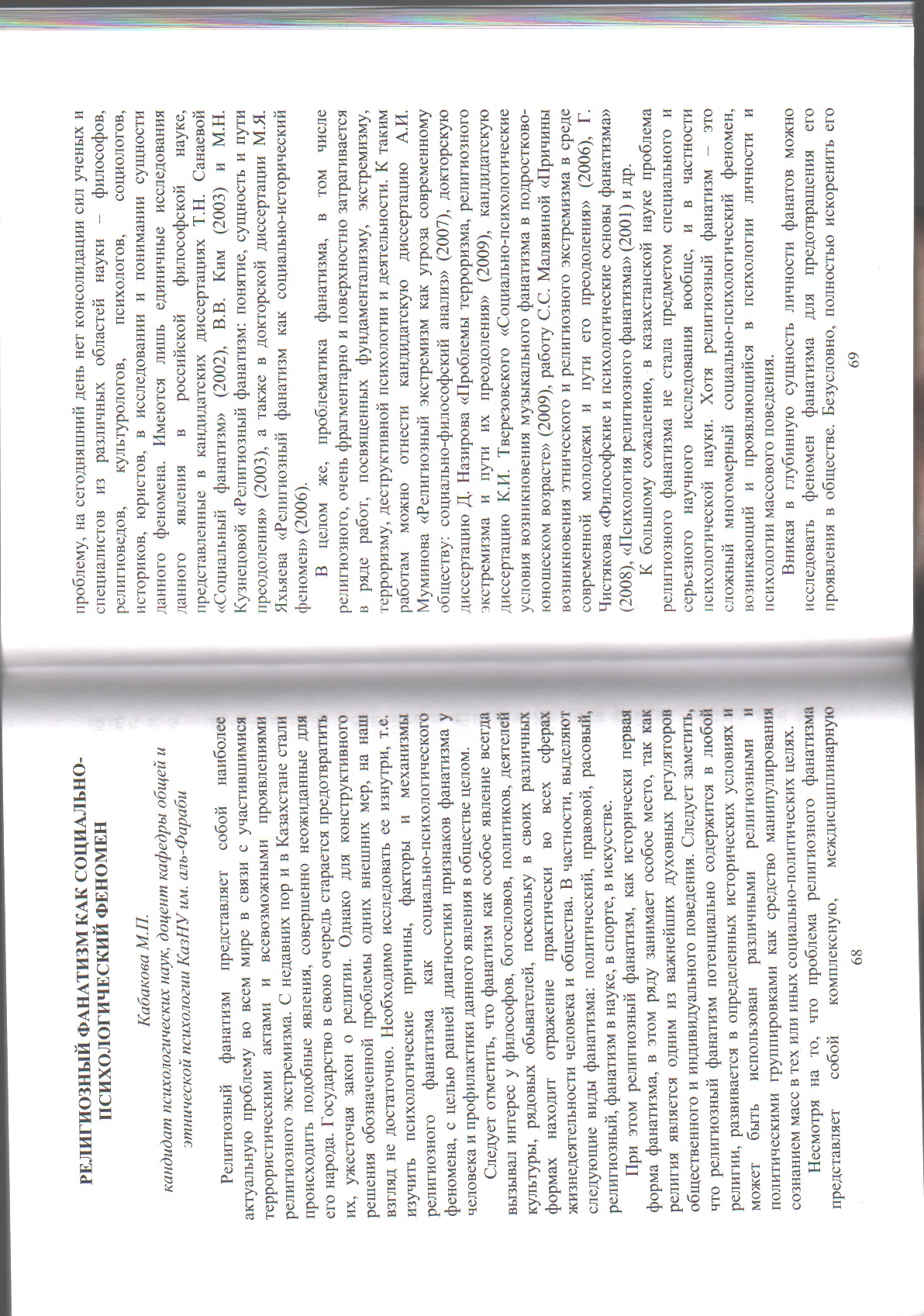 Религиозный фанатизм как социально-психологический феномен // Социально-психологический анализ проблемы влечения к смерти как одного из условий религиозного фанатизма: Материалы круглого стола с международным участием. – Караганда: КарГУ, 2012. – 118с. – С.68-76 (0,5 п.л.)