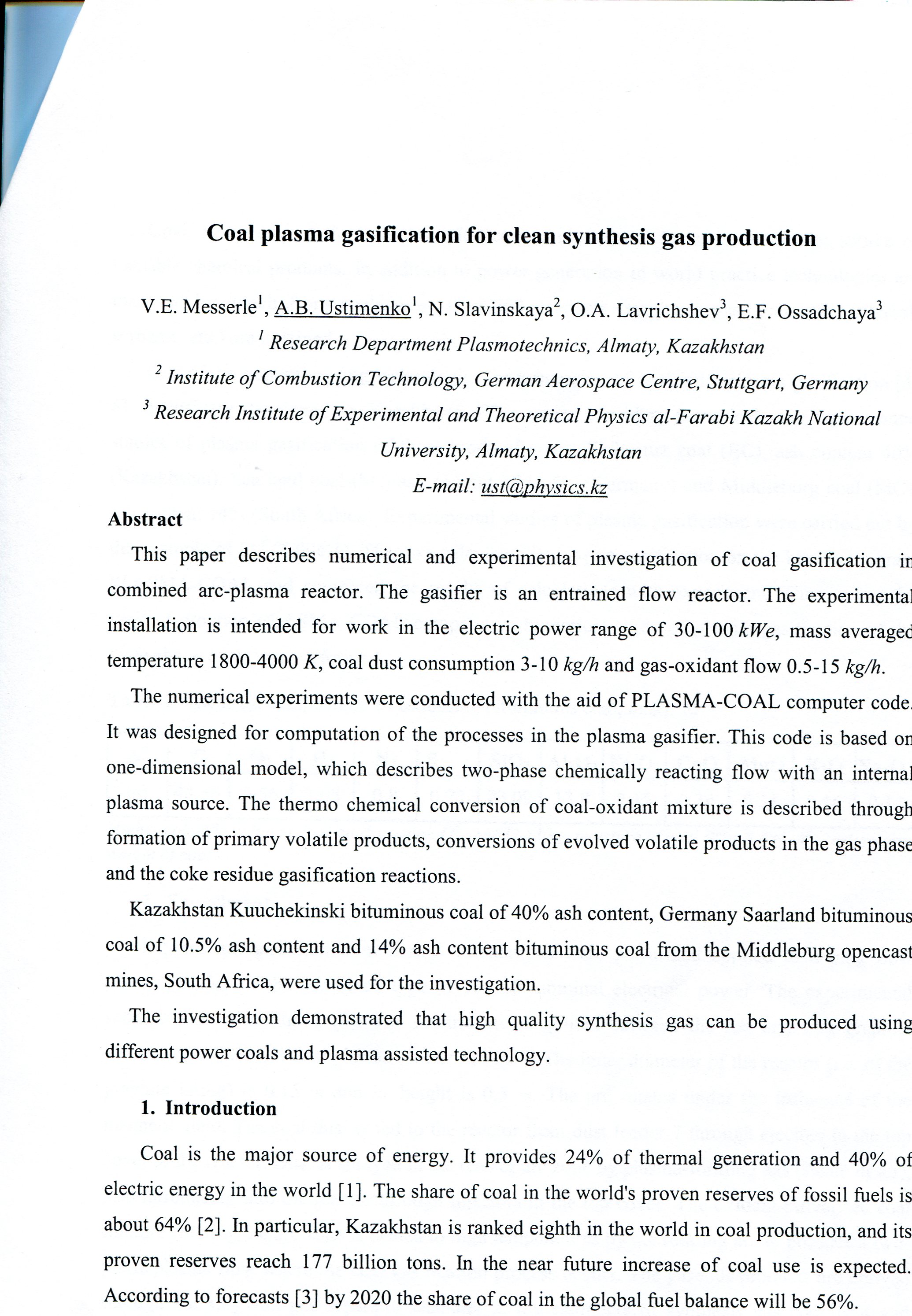 Coal plasma gasification for clean synthesis gas production