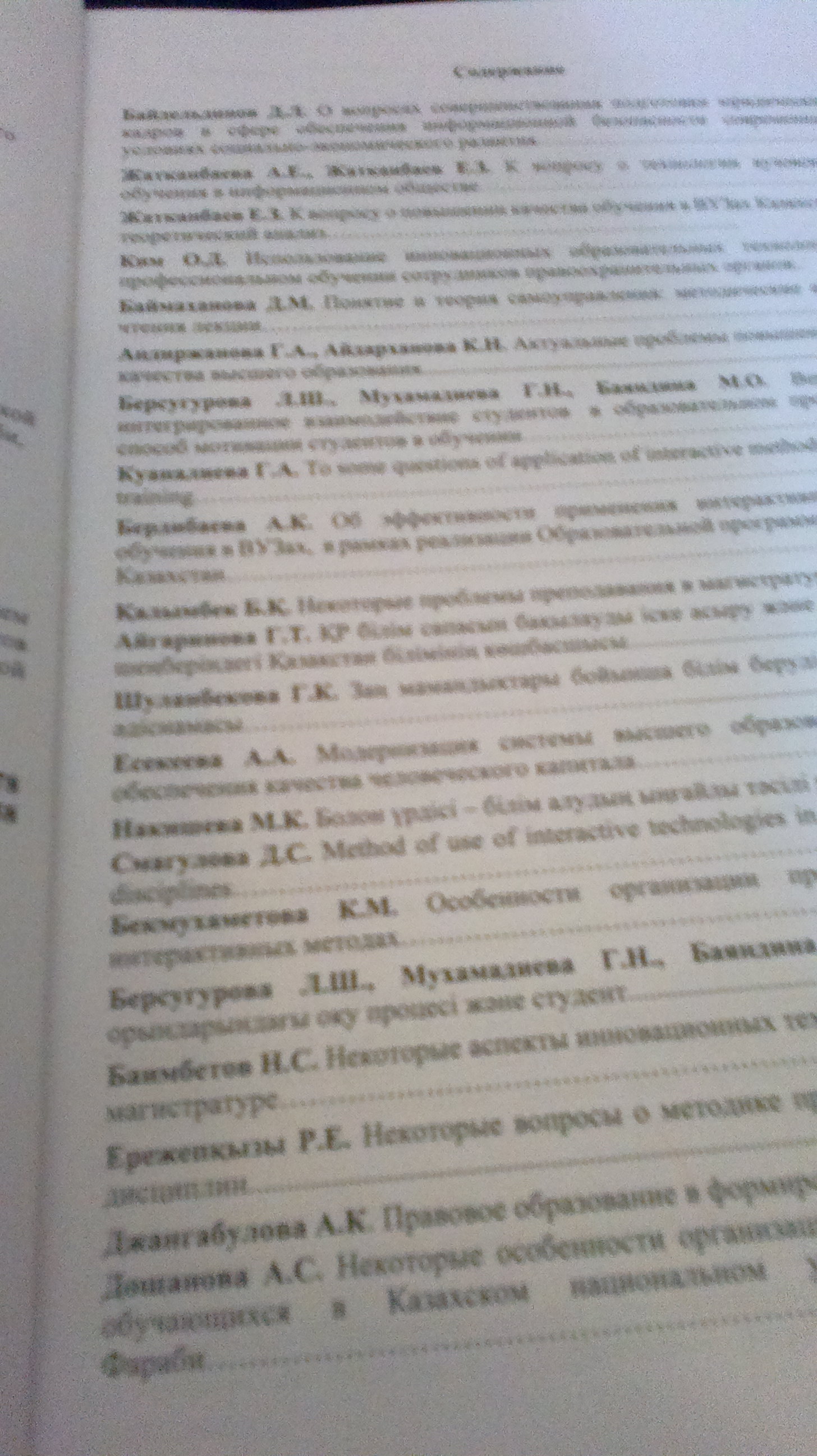 Жоғары оқу орындарындағы оқу процессі және студент (в соавт. Мухамадиева Г.Н., Баяндина М.О.) // Внедрение принципов болонской конвенции: проблемы реализации при подготовке магистрантов юридических специальностей: материалы международной учебно-методической конференции, 24 февраля 2015. – Алматы: КазНУ им. аль-Фараб