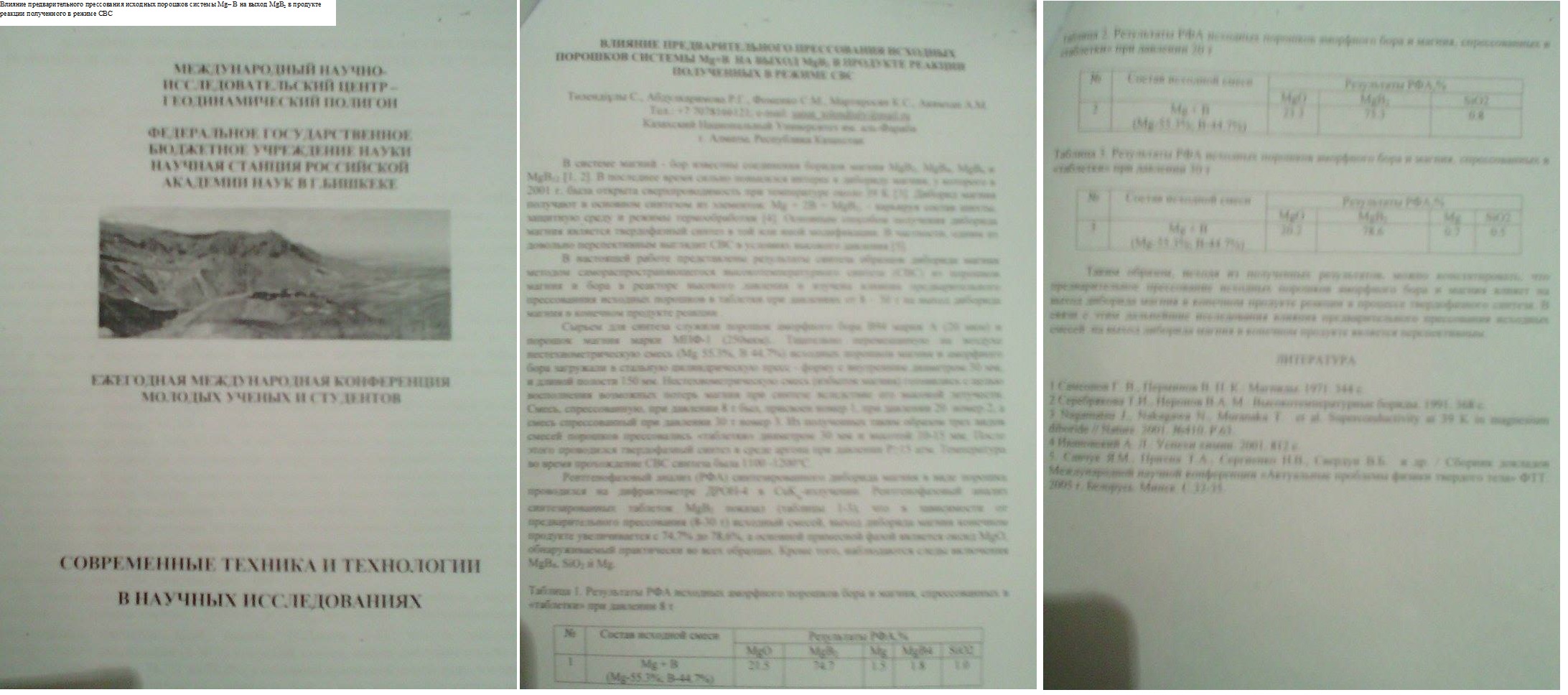 Влияние предварительного прессования исходных порошков системы Mg– B на выход MgB2 в продукте реакции полученного в режиме СВС