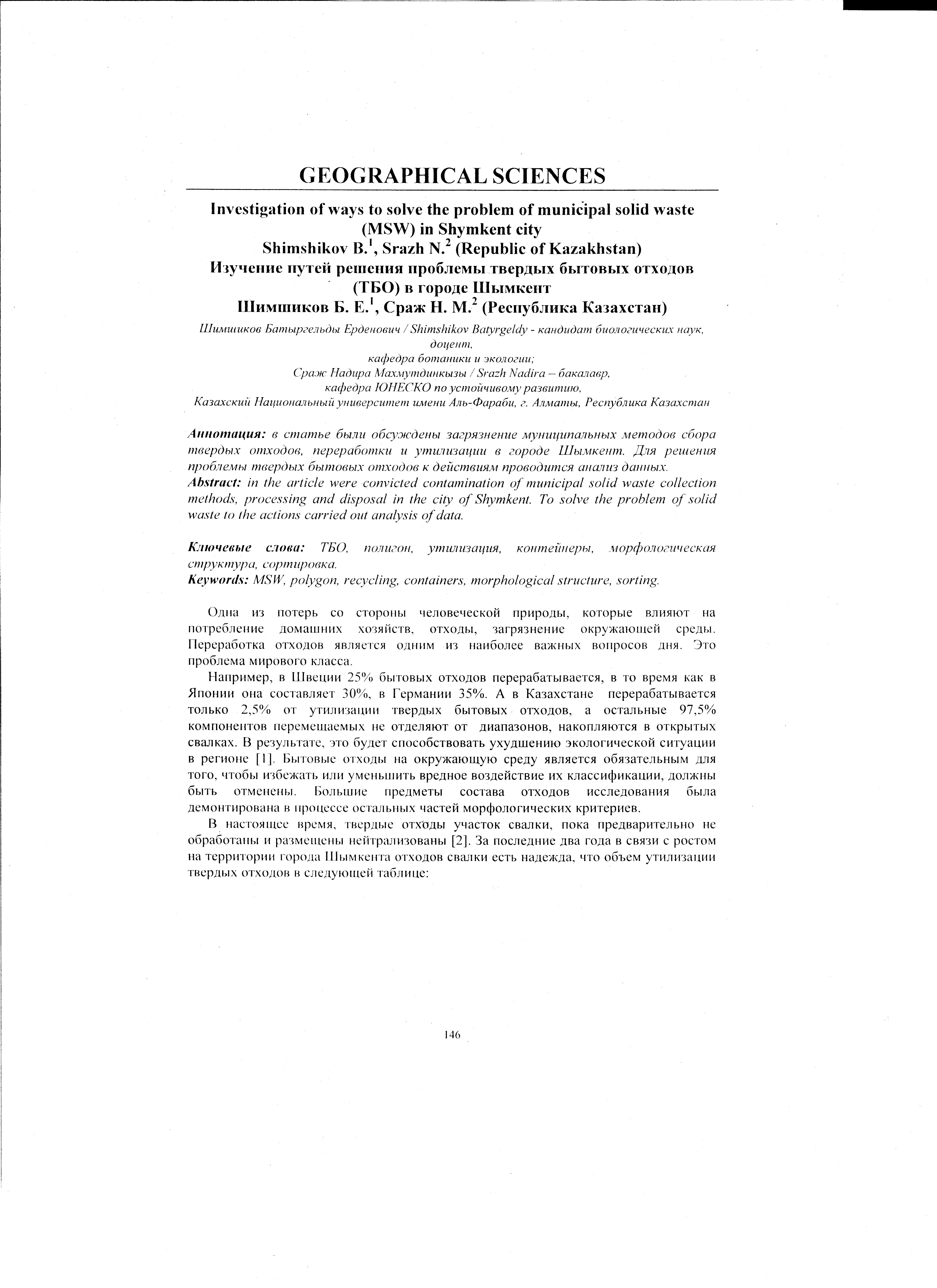 Investigation of ways to solve the problem of municipal solid waste (MSW) in Shymkent ciny.