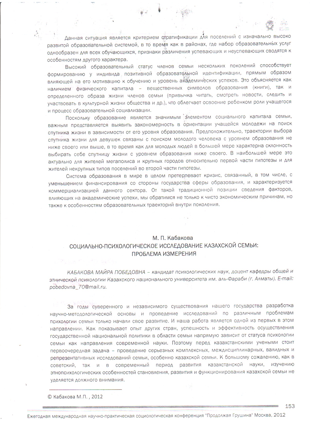 Социально-психологическое исследование казахской семьи: проблема измерения // Материалы II Междун. социологической научно-практической конференции "Продолжая Грушина", организованной по инициативе Всероссийского Центра Изучения Общест-венного Мнения (ВЦИОМ) при участии РАНХиГС – Москва, 2012г. - С. 154-156 (0,2 п.л.)