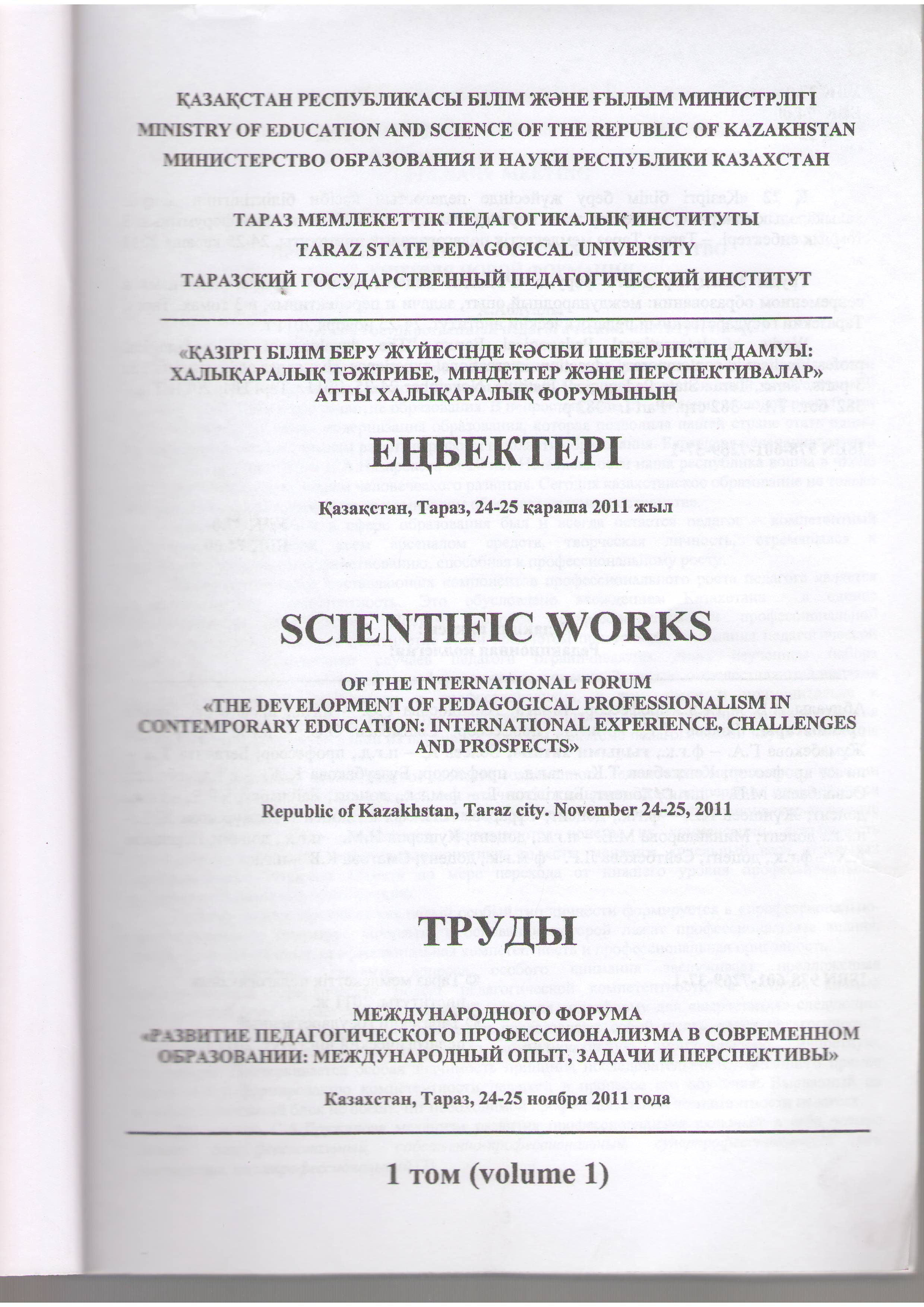 Педагогтар мен педагогикалық ма ман дықтардың имиджін қалыптастыру әлеумет тік психологиялық мәселе ретінде» \\Халықаралық Педагогикалық Форум.-Тараз.-24-25.2011г.-5 б.