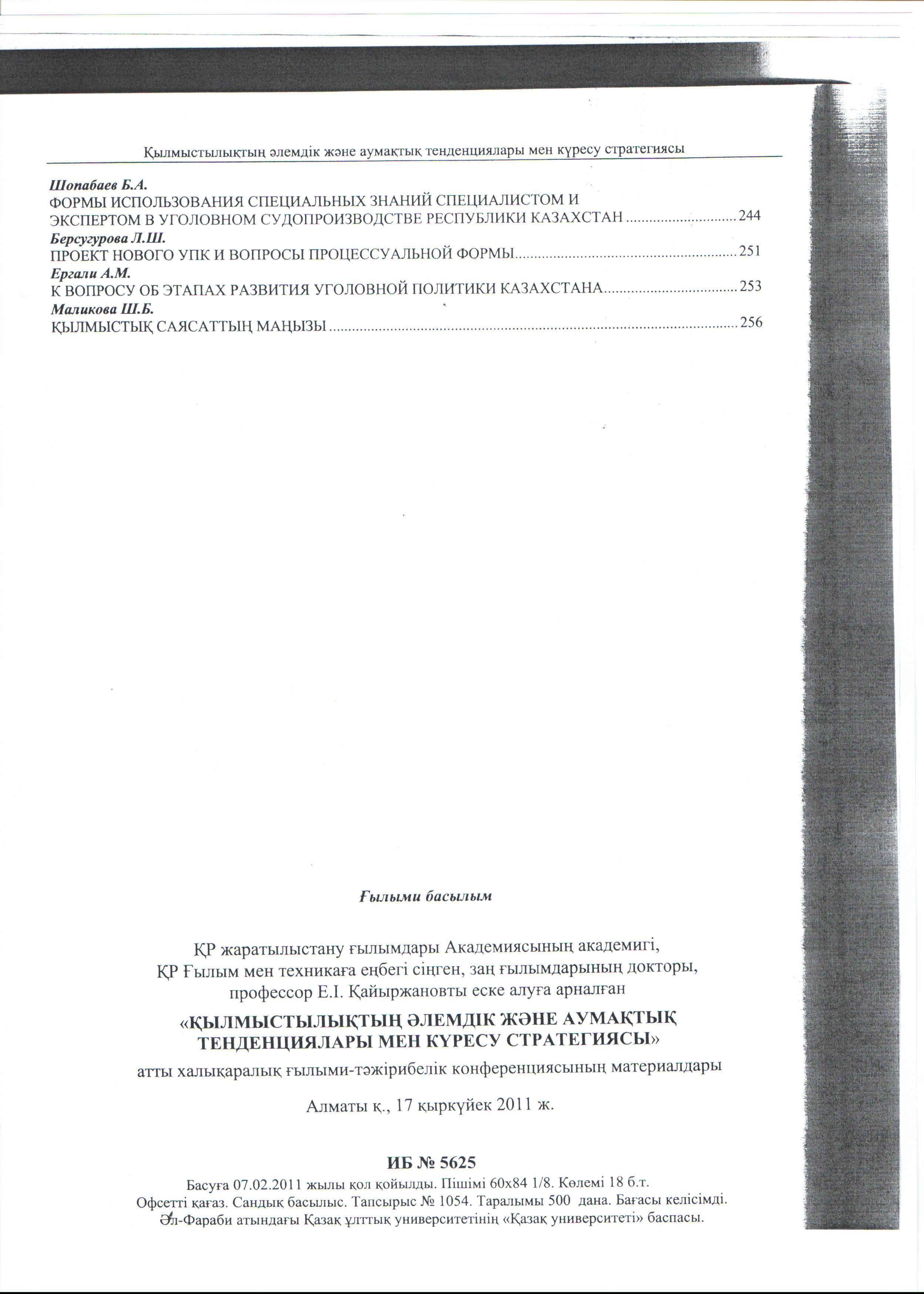 Проект нового УПК и вопросы процессуальной формы: Материалы Международной научно-практической конференции «Мировые и региональные тенденции современной преступности и стратегии развития противодействия» г.Алматы, 17 сентября 2011г. – С. 251-253).