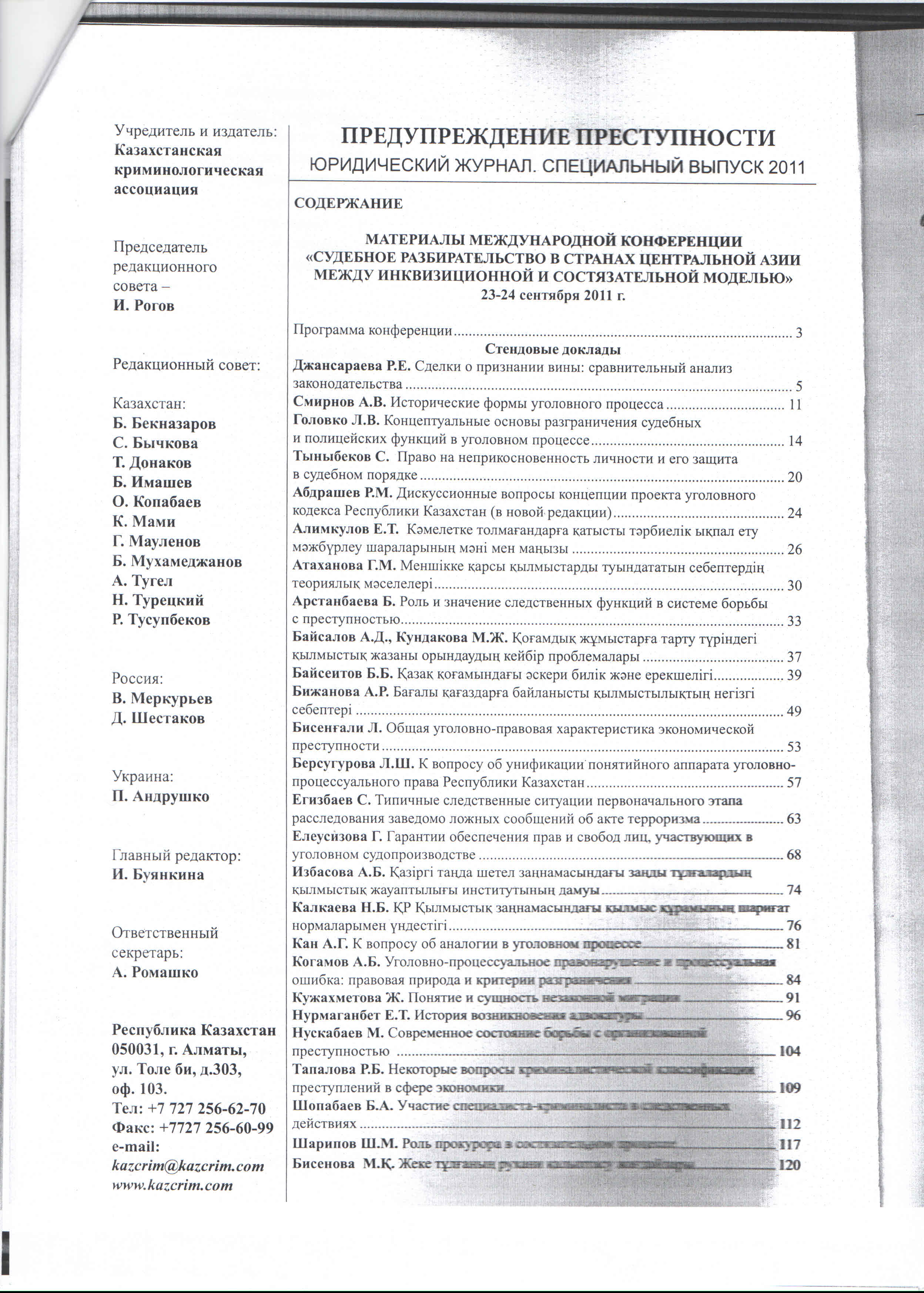 Проект нового УПК и вопросы процессуальной формы: Материалы Международной научно-практической конференции «Мировые и региональные тенденции современной преступности и стратегии развития противодействия» г.Алматы, 17 сентября 2011г. – С. 251-253).