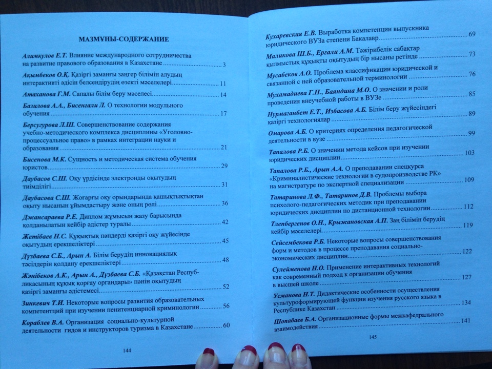 Берсугурова Л. Ш. Жоғары оқу орындарындағы оқу процессі және студент (в соавт. Мухамадиева Г.Н., Баяндина М.О.) // Внедрение принципов болонской конвенции: проблемы реализации при подготовке магистрантов юридических специальностей: материалы международной учебно-методической конференции, 24 февраля 2015. – Алматы: КазНУ им. аль-Фараб 2015 - г. 4 - стр.