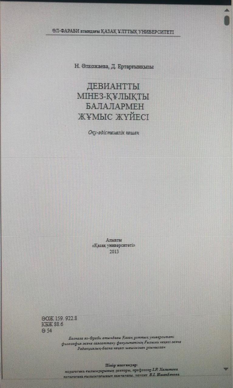 Девиантты мінез- құлықты балалармен жұмыс жүйесі: оқу-әдістемелік кешен