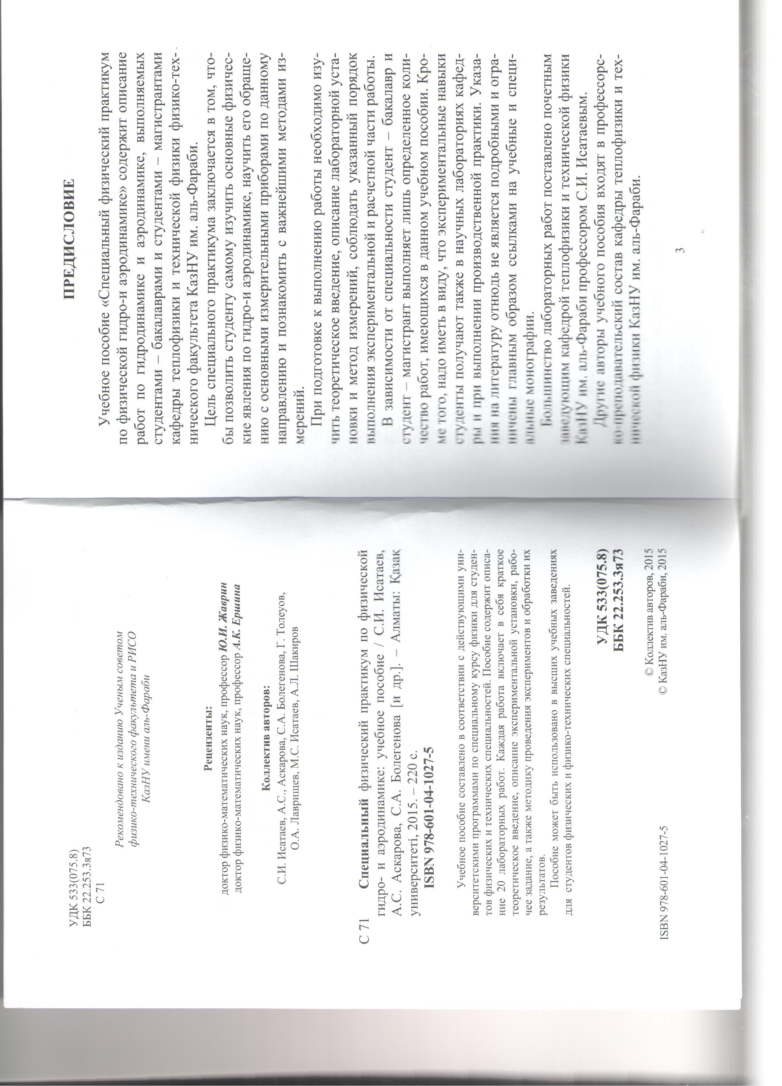Специальный физический практикум по физической гидро-и аэродинамике. Учебное пособие /Исатаев С.И., Аскарова А.С., Болегенова С.А., Толеуов Г., Лаврищев О.А., Исатаев М.С., Шакиров А.Л. – Алматы: Қазақ университеті, 2014. – 226 с.
