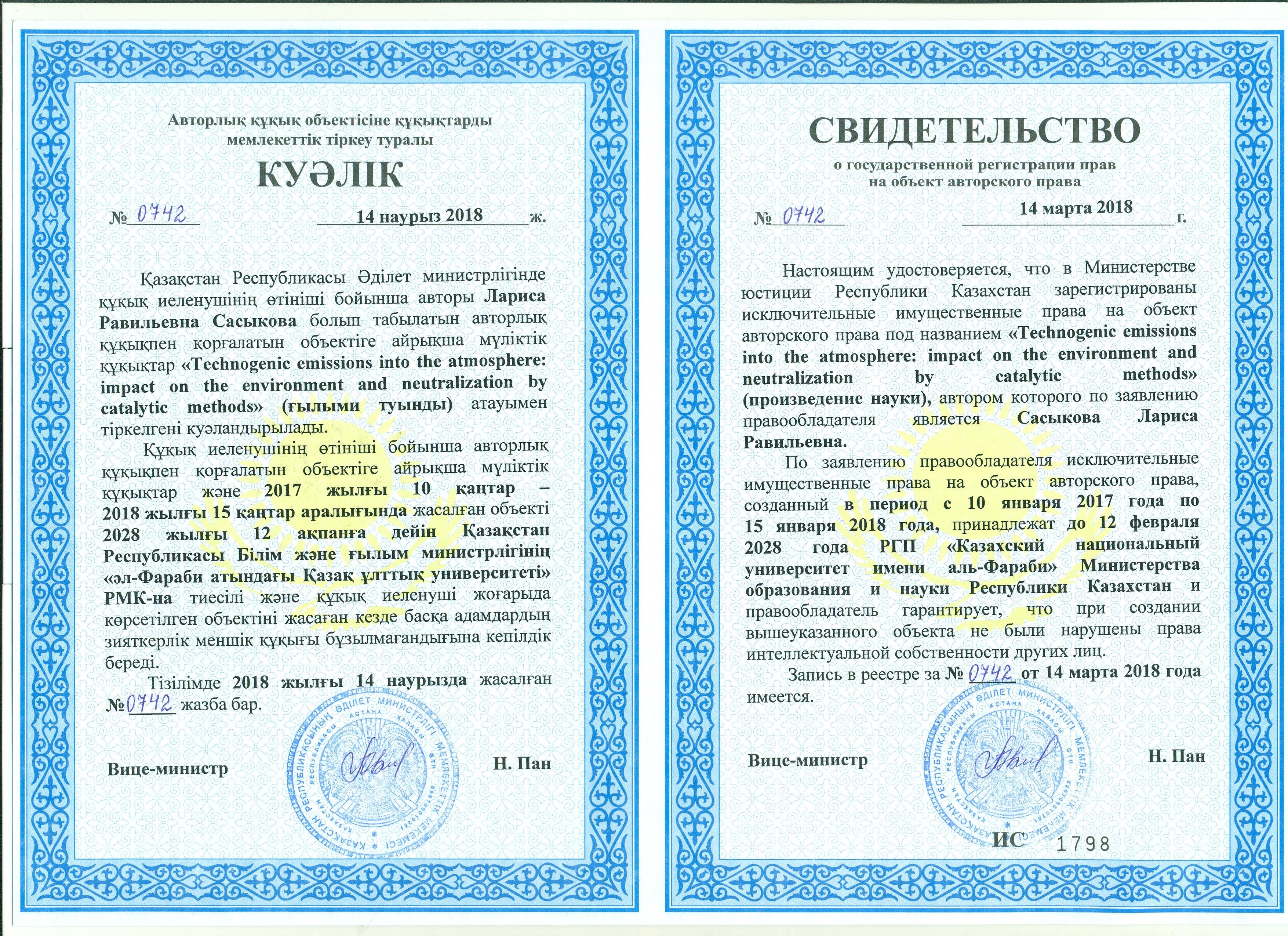 Свидетельство №0742 (Патент РК) от 14 марта 2018 года на монографию
