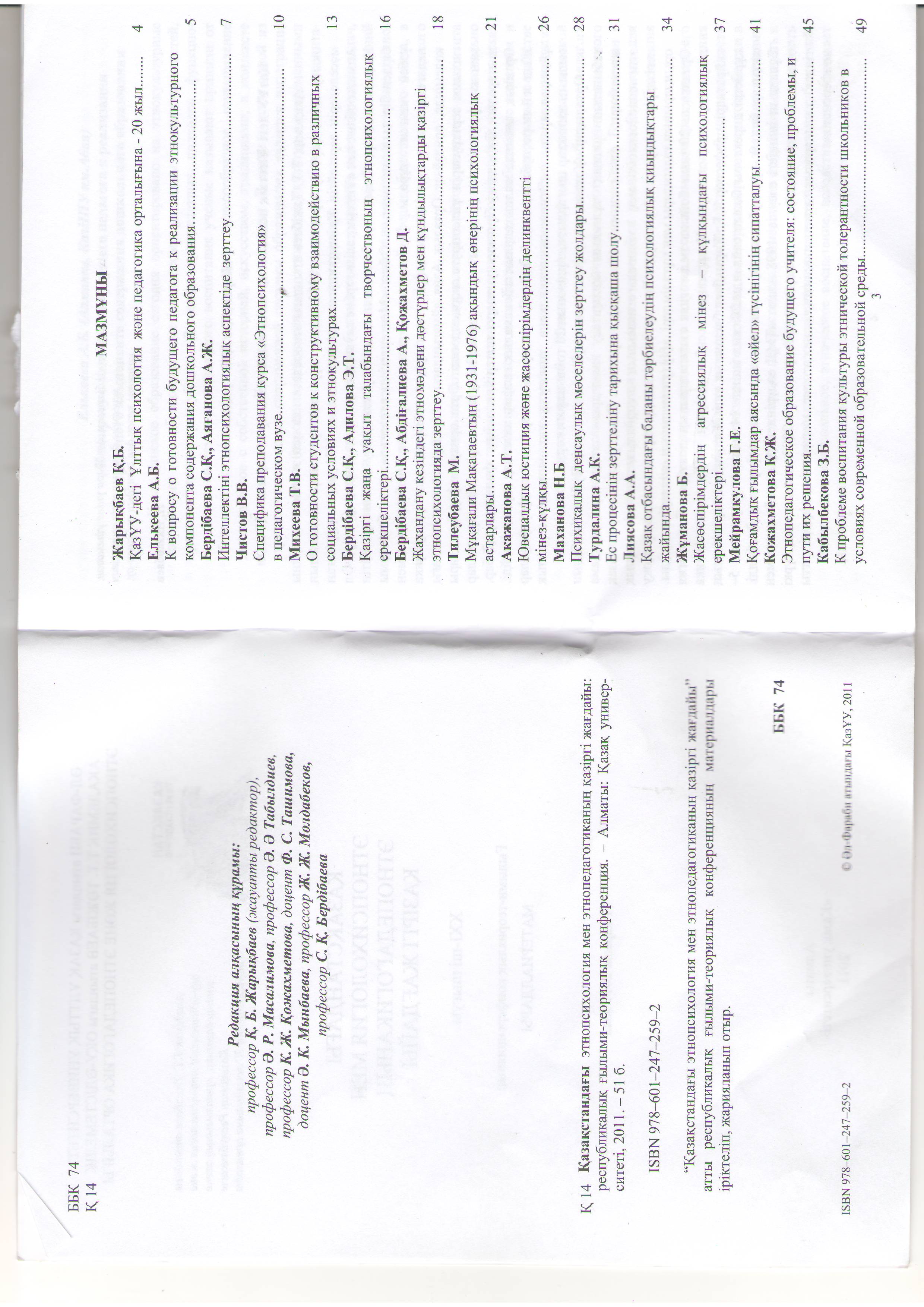 Жаһандану кезіндегі этно-мәдени дәстүрлер мен құндылықтарды қазіргі этнопсихологияда зерттеу. \\Респ.ғыл. практ.конф. мат. ҚазҰУ.-2011. .Алматы, 3 б