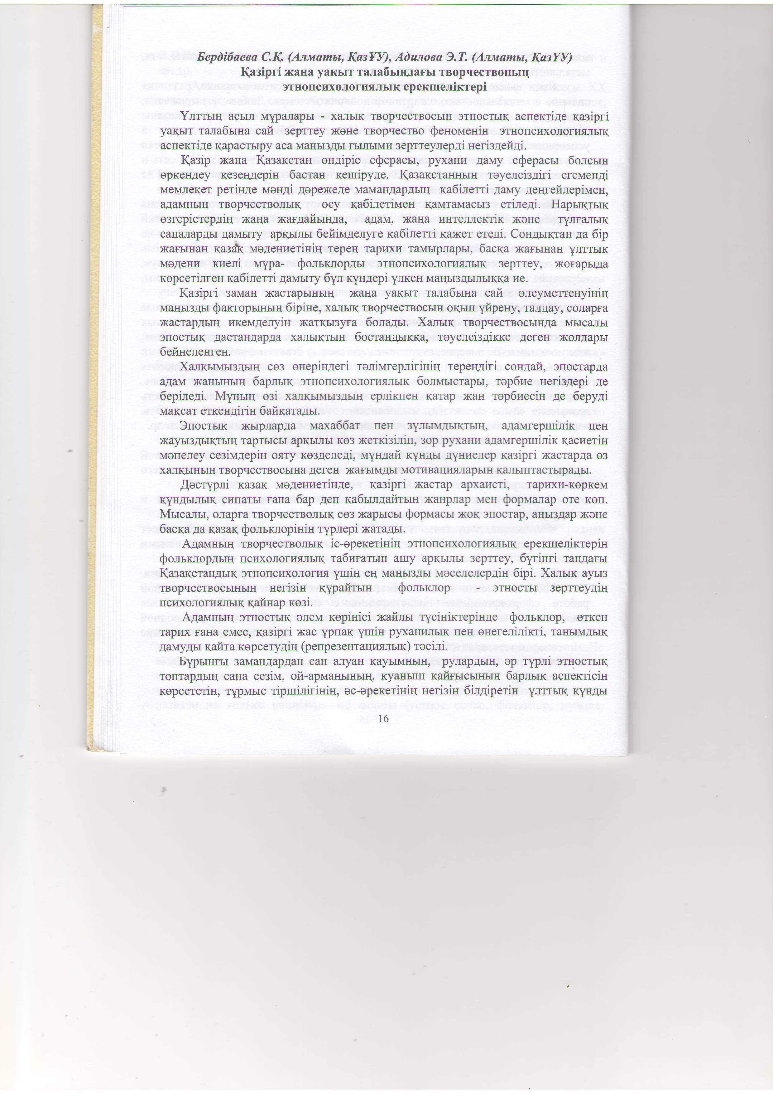 Қазіргі жаңа уақыт талабындағы творчествоның этнопсихологиялық ерекшеліктері» \\Респ.ғыл. практ.конф. мат. ҚазҰУ.-2011. .Алматы, 3 б