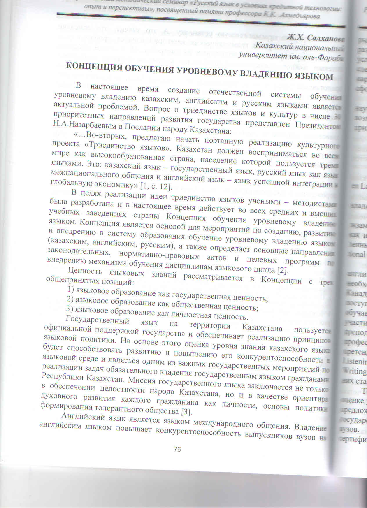 Концепция обучения уровневому владению языком//Республиканский методический семинар-тренинг на тему «Русский язык в условиях кредитной технологии: опыт и перспективы», Алматы, КазНУ им.аль-Фараби 22.02.13, с.76-81