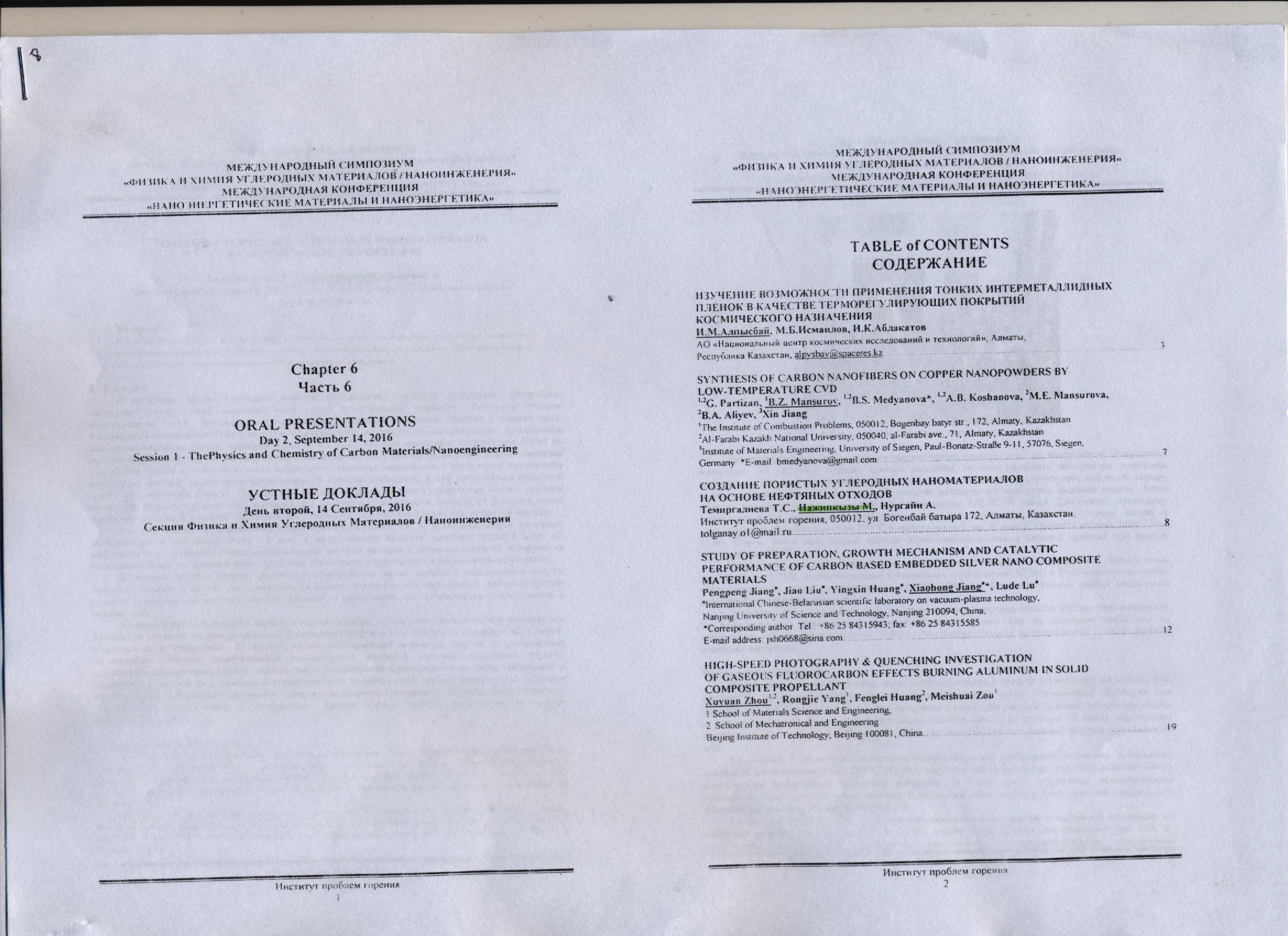 Султанов Ф., Бакболат Б., Даулбаев Ч., Уразгалиева А., Азизов З., Мансуров З. Спонжи на основе углеродных наноматериалов для разделения воды и нефтепродуктов // Материалы IX международного симпозиума «Физика и химия углеродных материалов / Наноинженерия» и международной конференции «Наноэнергетические материалы и на