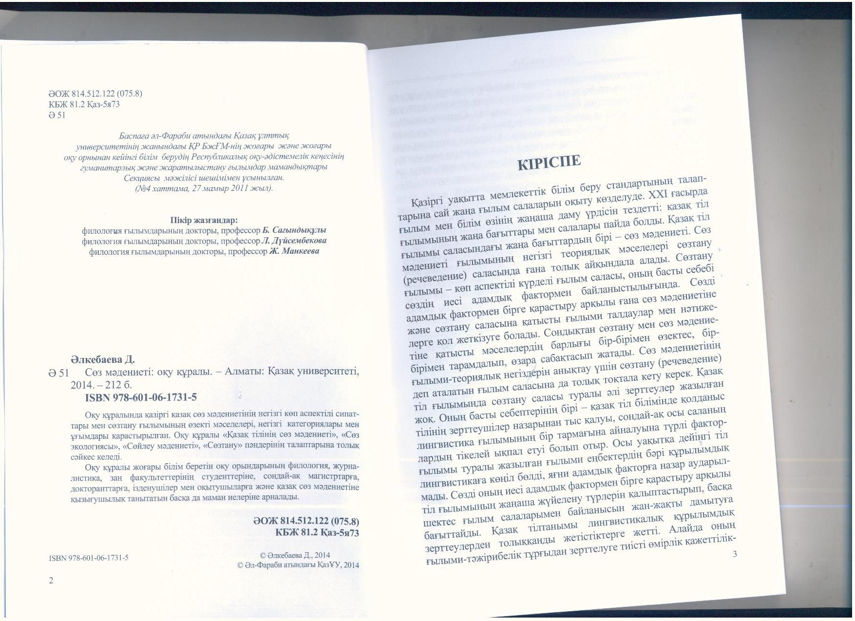 "Қазақ тілі мен әдебиеті" оқу құралы (14 баспа табақ). Әл-Фараби атындағы ҚазҰУ Редакциялық баспа кеңесінің шешімімен баспаға ұсынылды. 19 мамыр, №4 хаттама.