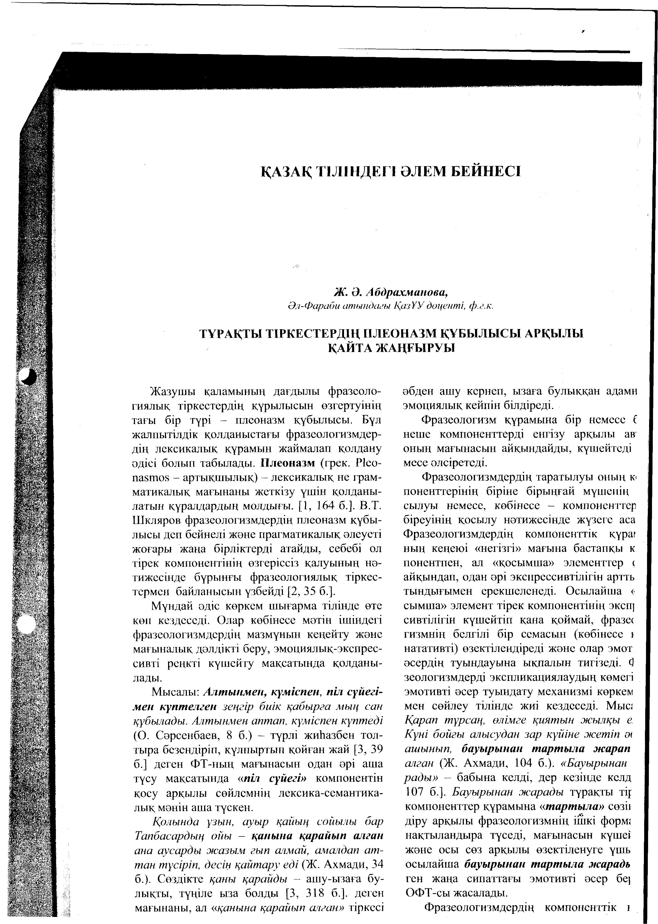 Тұрақты тіркестердің плеоназм құбылысы арқылы қайта жаңғыруы