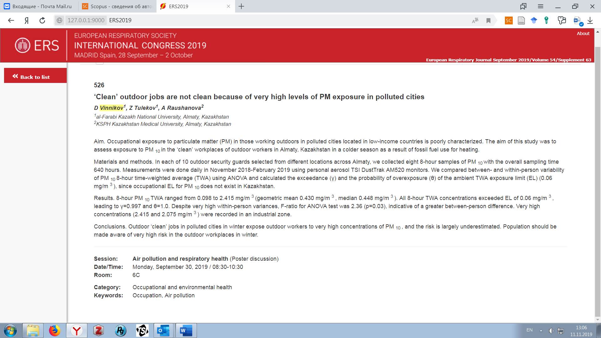 ‘Clean’ outdoor jobs are not clean because of very high levels of PM exposure in polluted cities. Abstracts of the European Respiratory Society Annual Congress