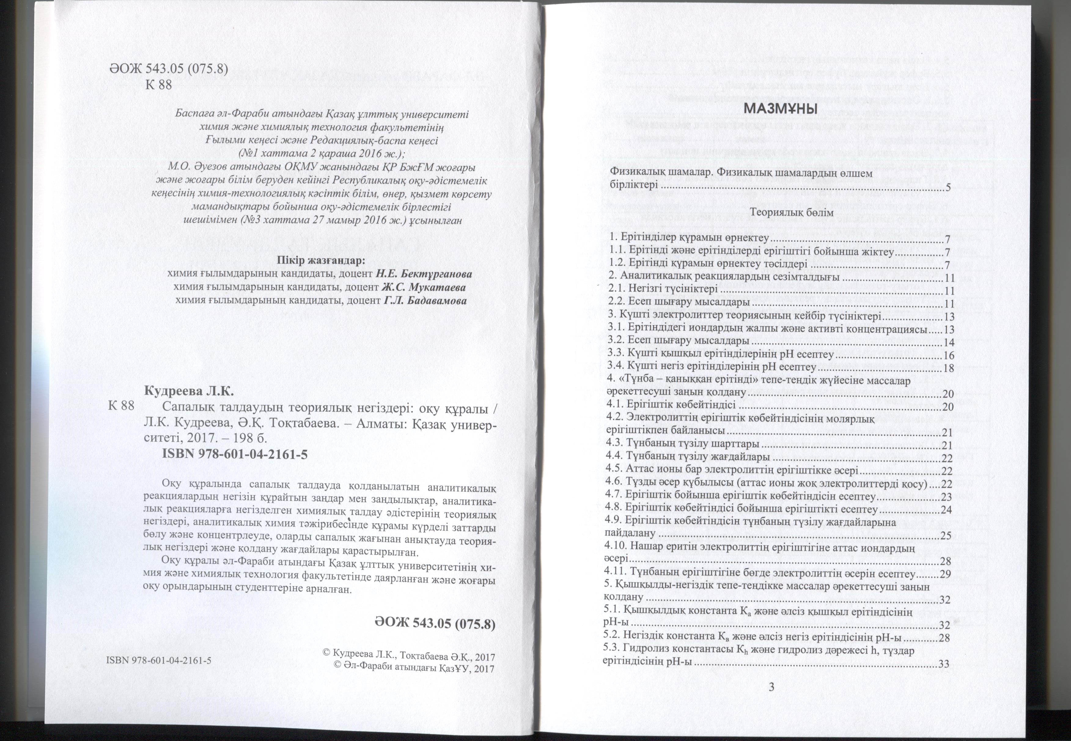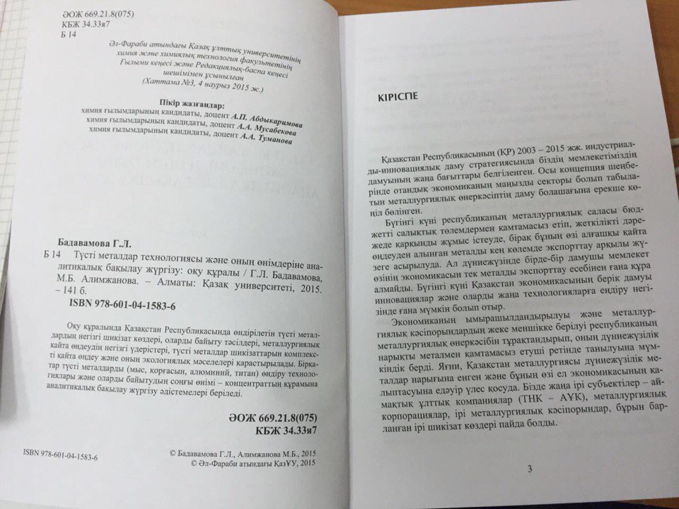 Түсті металдар технологиясы және оның өнімдеріне аналитикалық бақылау жүргізу. Алматы, Қазақ университеті, 2015 ж. 140 бет.