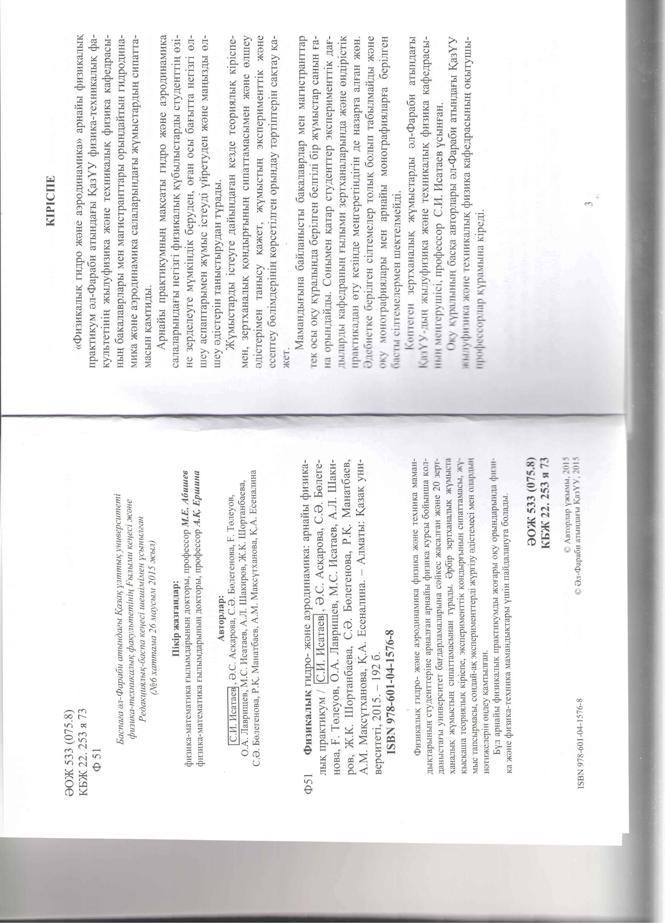 Физикалық гидро- және аэродинамика бойынша арнайы физикалық практикум. Оқу құралы /Исатаев С.И., Асқарова А.С., Бөлегенова С.А., Төлеуов Г., Лаврищев О.А., Исатаев М.С., Шакиров А.Л., Шортанбаева Ж.К., Болегенова С.А., Манатбаев Р.К., Максутханова А.М., Есеналина К.А.–Алматы: Қазақ университеті, 2015. – 229б.