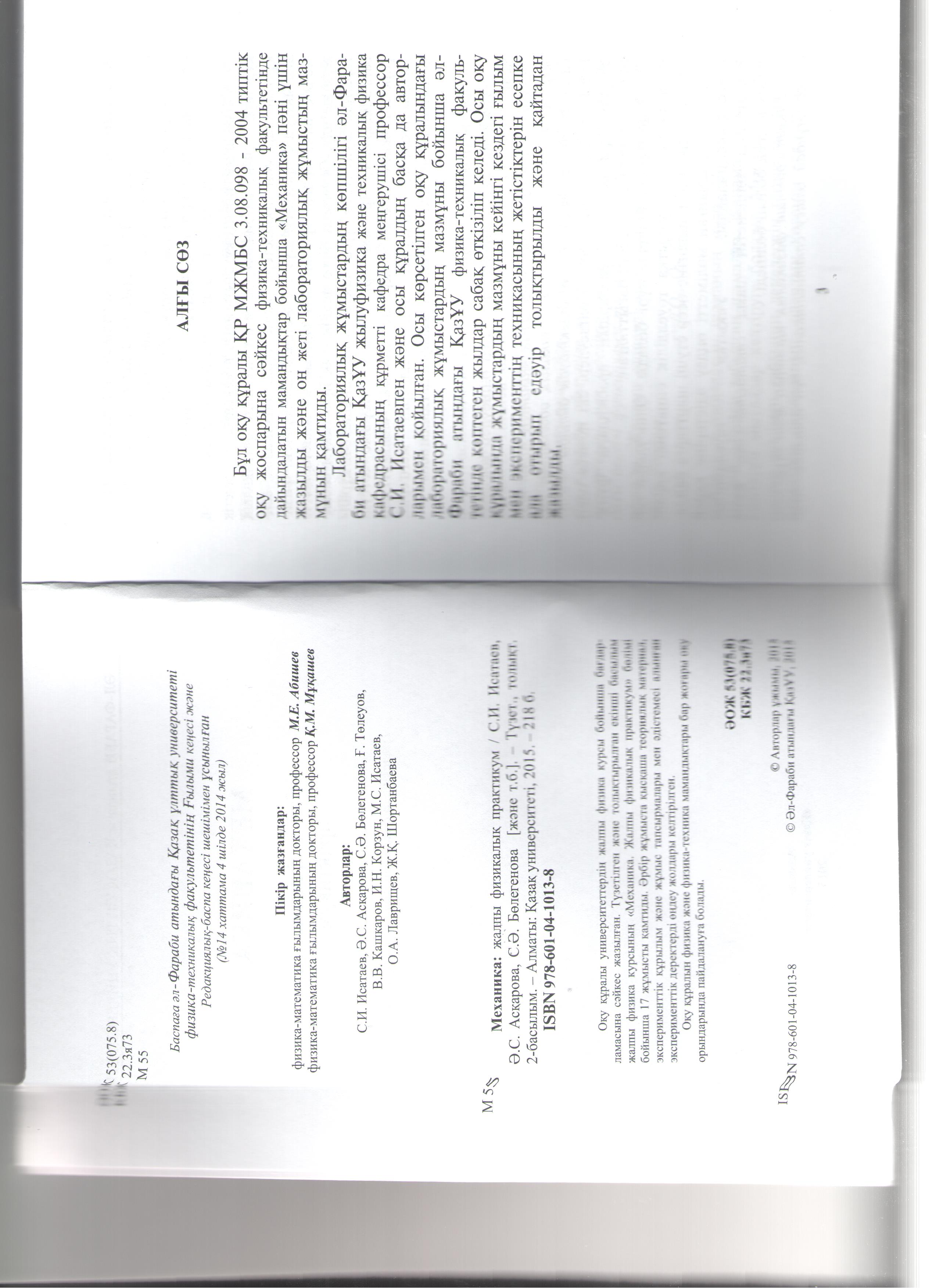 Механика. Жалпы физикалық практикум. Æî¹àðû îºó îðûíäàðûíû» ñòóäåíòòåðiíå àðíàë¹àí îºó º½ðàëû. /Исатаев С.И., Аскарова А.С., Болегенова С.А., Толеуов Г., Кашкаров В.В., Корзун И.Н., Исатаев М.С., Лаврищев О. А., Шортанбаева Ж.К. –Àëìàòû: ²àçຠóíèâåðñèòåòi, 2015.-218б.
