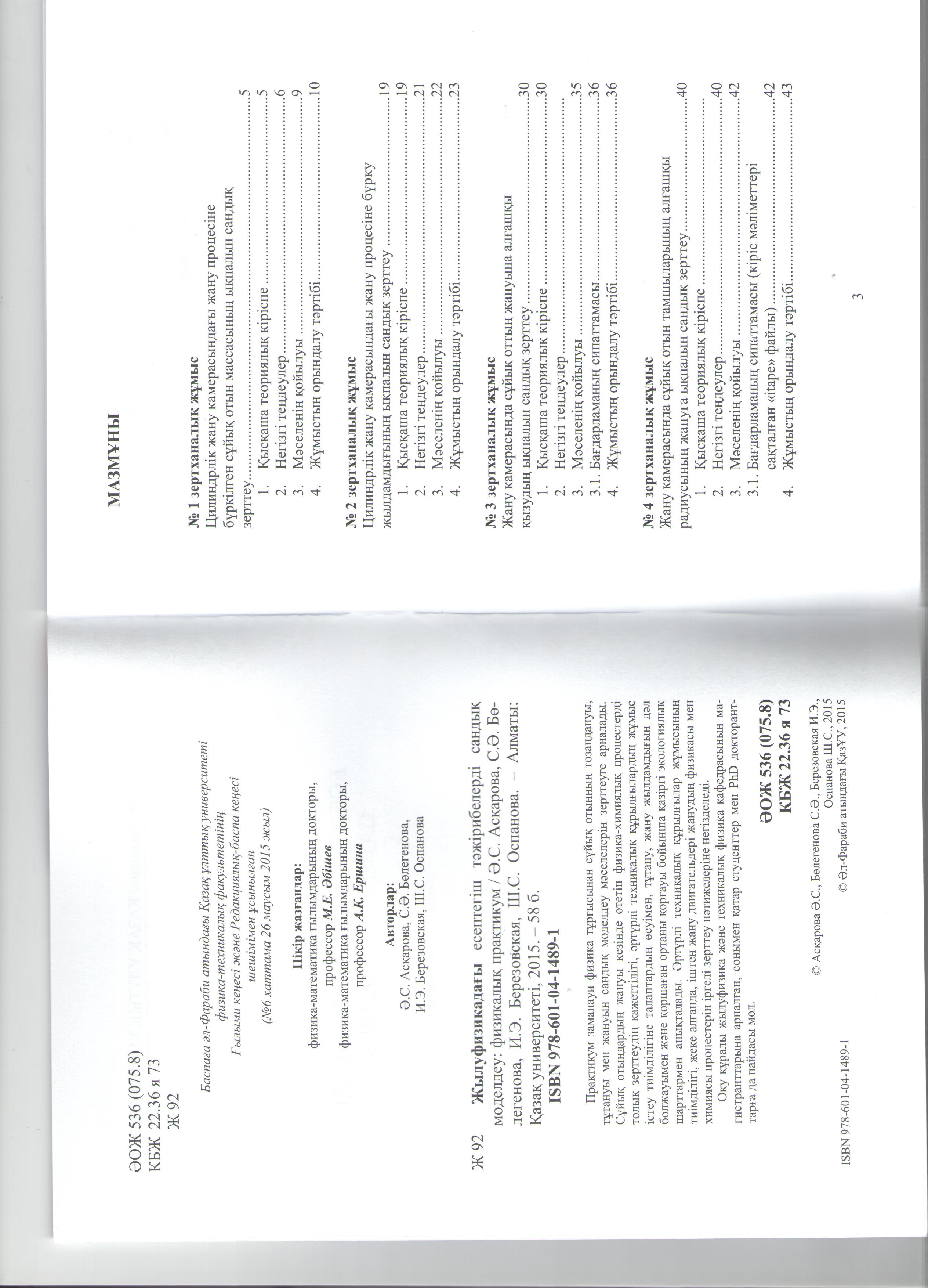 "Физикалық практикум. Жылуфизикадағы есептегіш тәжірибелерді сандық моделдеу". Студенттермен магистранттарға арналған оқу құралы. / Асқарова А.С., Бөлегенова С.Ә., Березовская И.Э. Алматы: әл-Фараби атындағы ҚазҰУ, 2015. – 60 б.