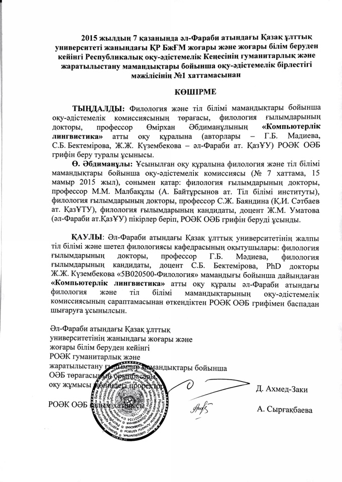 Оқу құралы. Мадиева Г.Б., Бектемирова С.Б., Кузембекова Ж.Ж. Компьютерлік лингвистика. – Алматы, 2016. – 240 б.